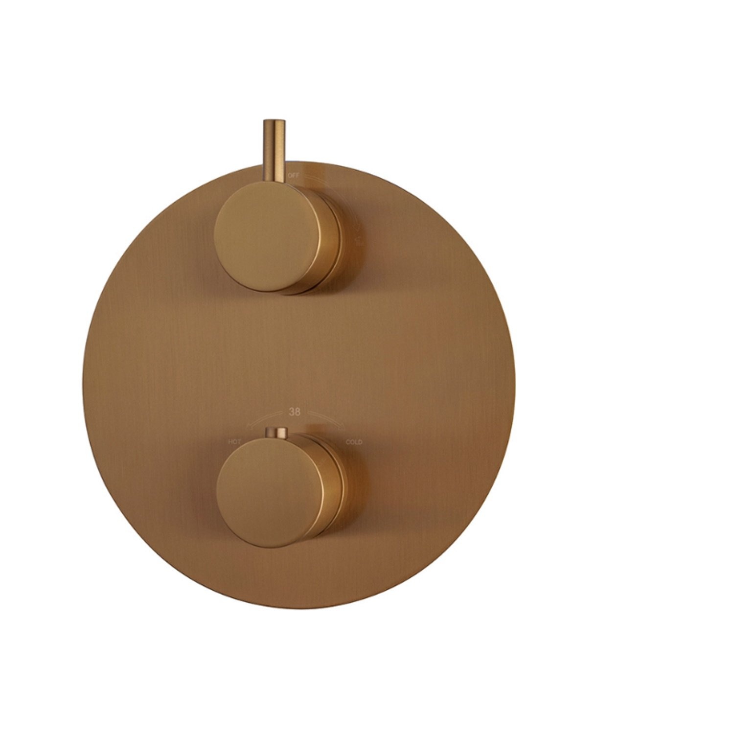 De thermostaat bestaat uit 2 bedieningen. Een bediening is voor de thermostaat en de andere gebruikt u om de kraan mee aan of uit te zetten en u kunt bepalen welke van de twee aansluitingen u wilt gebruiken. Bijvoorbeeld om de handdouche of de hoofddouche aan te zetten.
