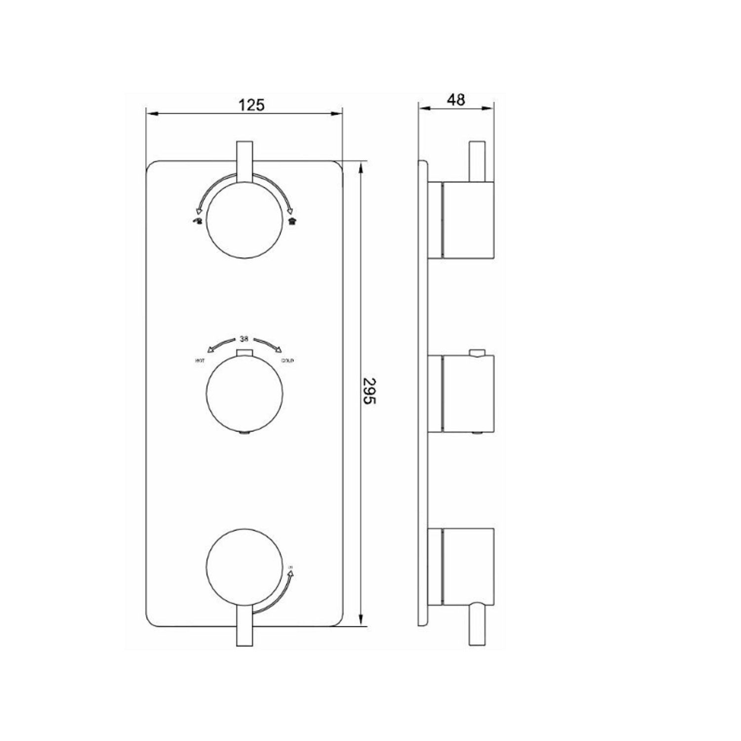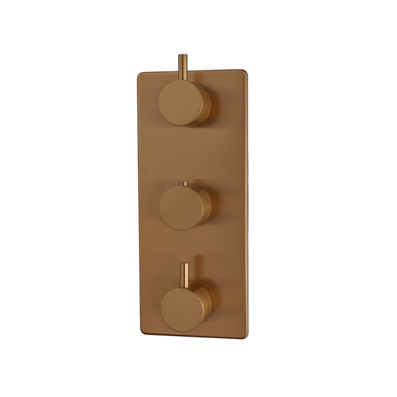 De afdekplaat is 12,5x32 cm. De douchethermostaat is van messing in de kleur geborsteld brons koper. Om deze kraan goed te laten werken heeft u hierbij een Bit inbouwdeel 3-weg nodig. Deze is niet inbegrepen en kunt u los mee bestellen.
