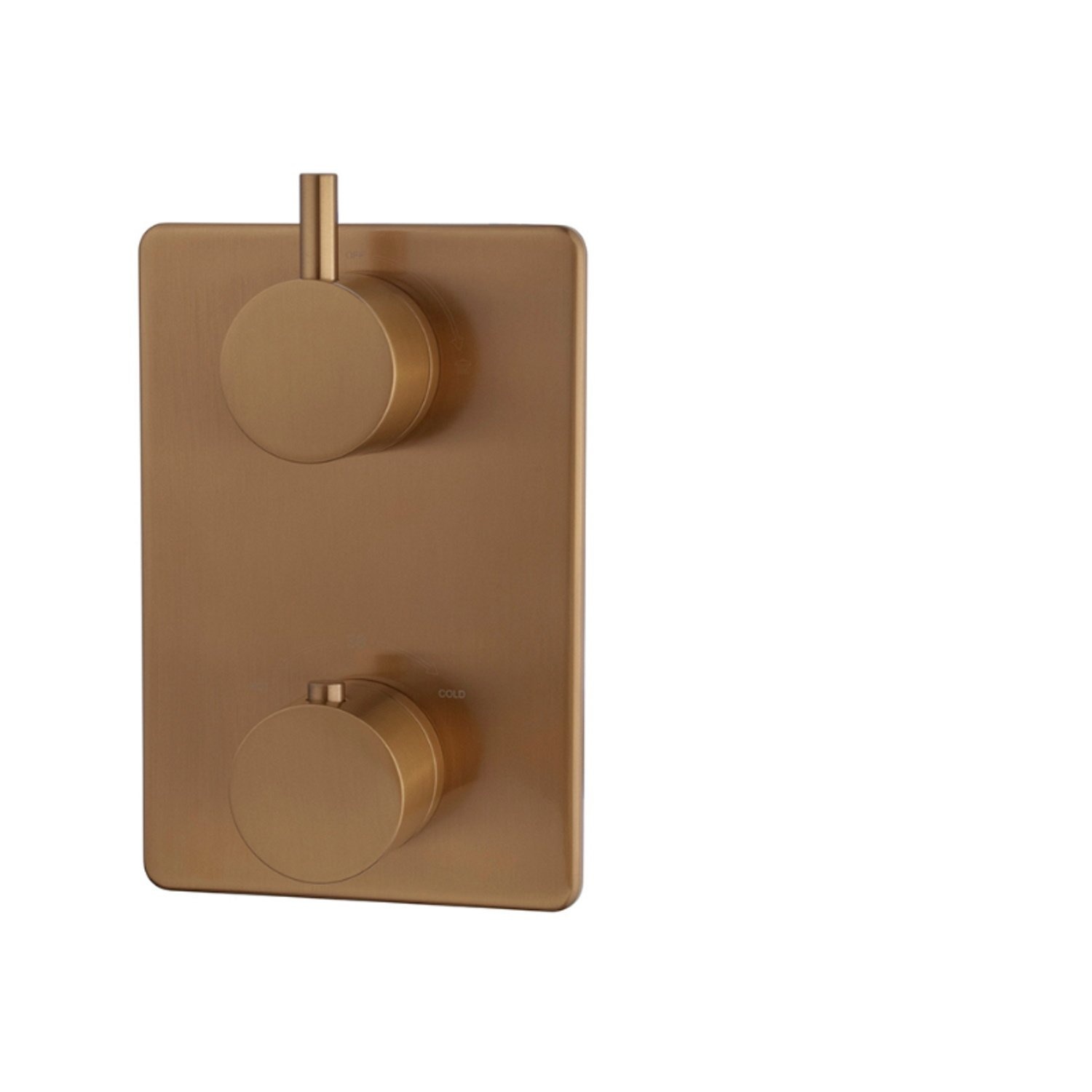 Deze koper kleurige thermostatische douchekraan is een eyecatcher in uw badkamer. Het design past perfect in vele interieurstijlen. De thermostaat is compleet met zowel een inbouwdeel als een afbouwdeel. De thermostaat bestaat uit 2 bedieningsknoppen. Met de bovenste knop wisselt u eenvoudig tussen de hoofddouche en de handdouche. De onderste knop is de thermostaatbediening en heeft een begrenzing op 38 graden celcius. Deze begrenzer maakt uw kraan extra gebruiksvriendelijk en voorkomt verbranding door te heet water bij bijvoorbeeld kinderen. Bovendien krijgt u direct water op de temperatuur die u heeft ingesteld en blijft de temperatuur constant.