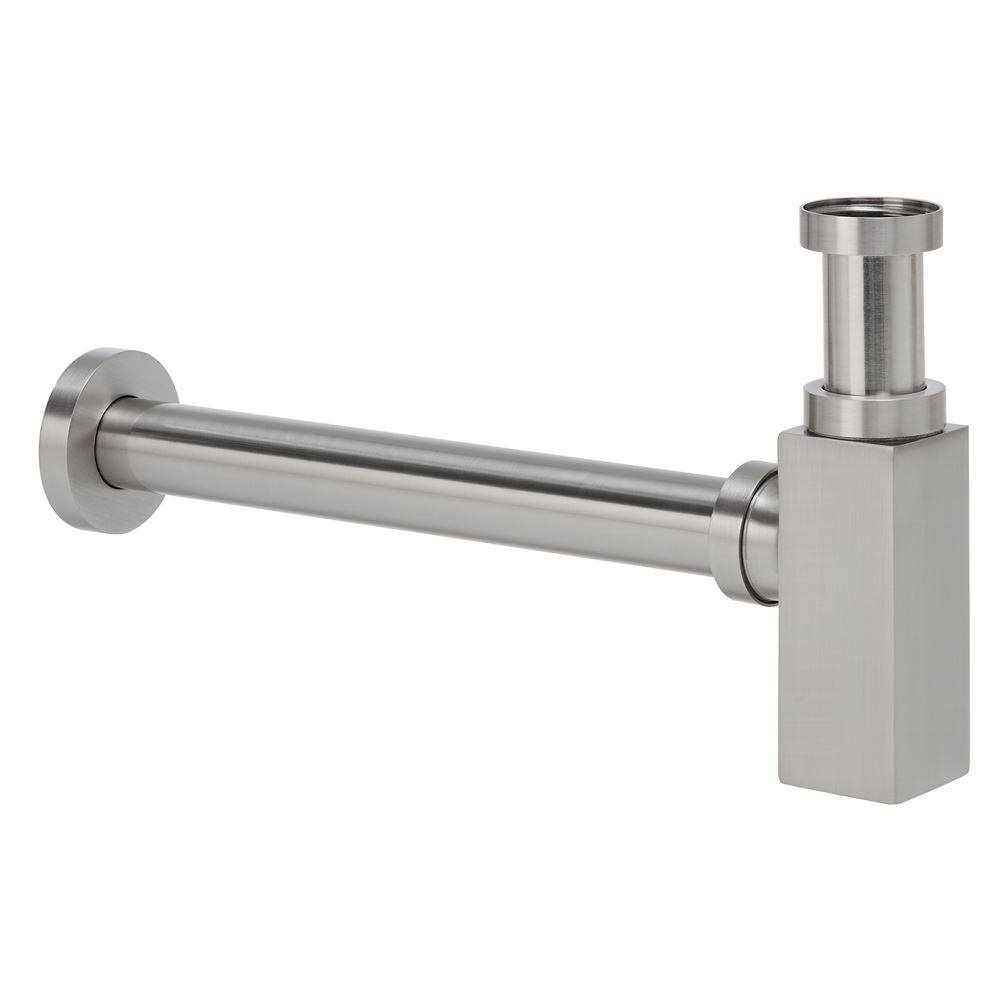 Star Luxe bekersifon vierkant 11/4" RVS look met muurbuis en rozet. Voor de toevoer naar uw gootsteen, wastafel of fontein. wegens de makkelijk afschroefbare bodemdop is het eenvoudig om dit product schoon te houden. Dit product staat garant voor kwaliteit en is leverbaar door heel Nederland.