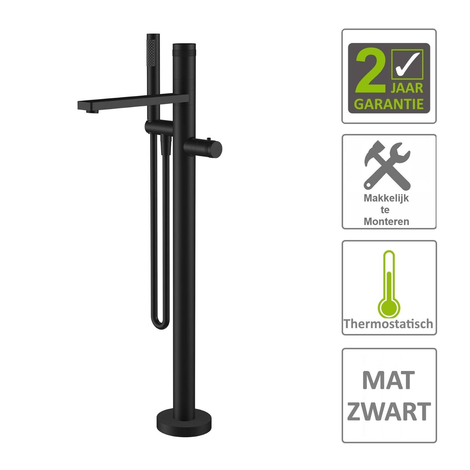 Deze vrijstaande badkraan, uit de serie Exclusive past perfect bij een vrijstaand bad. De mat zwarte badkraan is een echte eye catcher bij uw bad! De badkraan wordt compleet geleverd met uitloop, staander, doucheslang, staafhanddouche en thermostaat.