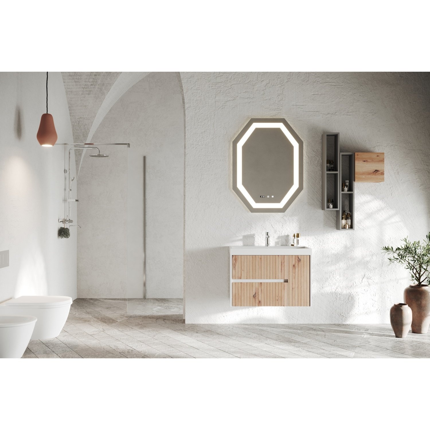 Uit de serie Friuli van Van Marcke komt deze fraaie badkamerkast. De badkamerkast heeft een gouden eik kleur en is voorzien van twee softclose lades en een soft-close deur. De badkamerkast is 60 cm lang, 40 cm breed en 55 cm hoog. Het materiaal bestaat uit MDF kern met MDF gegroefde afwerking. De rechthoekige wastafel is uitgevoerd in galnzend wit en heeft een kraangat. Niet inbegrepen is een wastafelmengkraan. De wastafel is 60 cm lang en 40 cm breed.