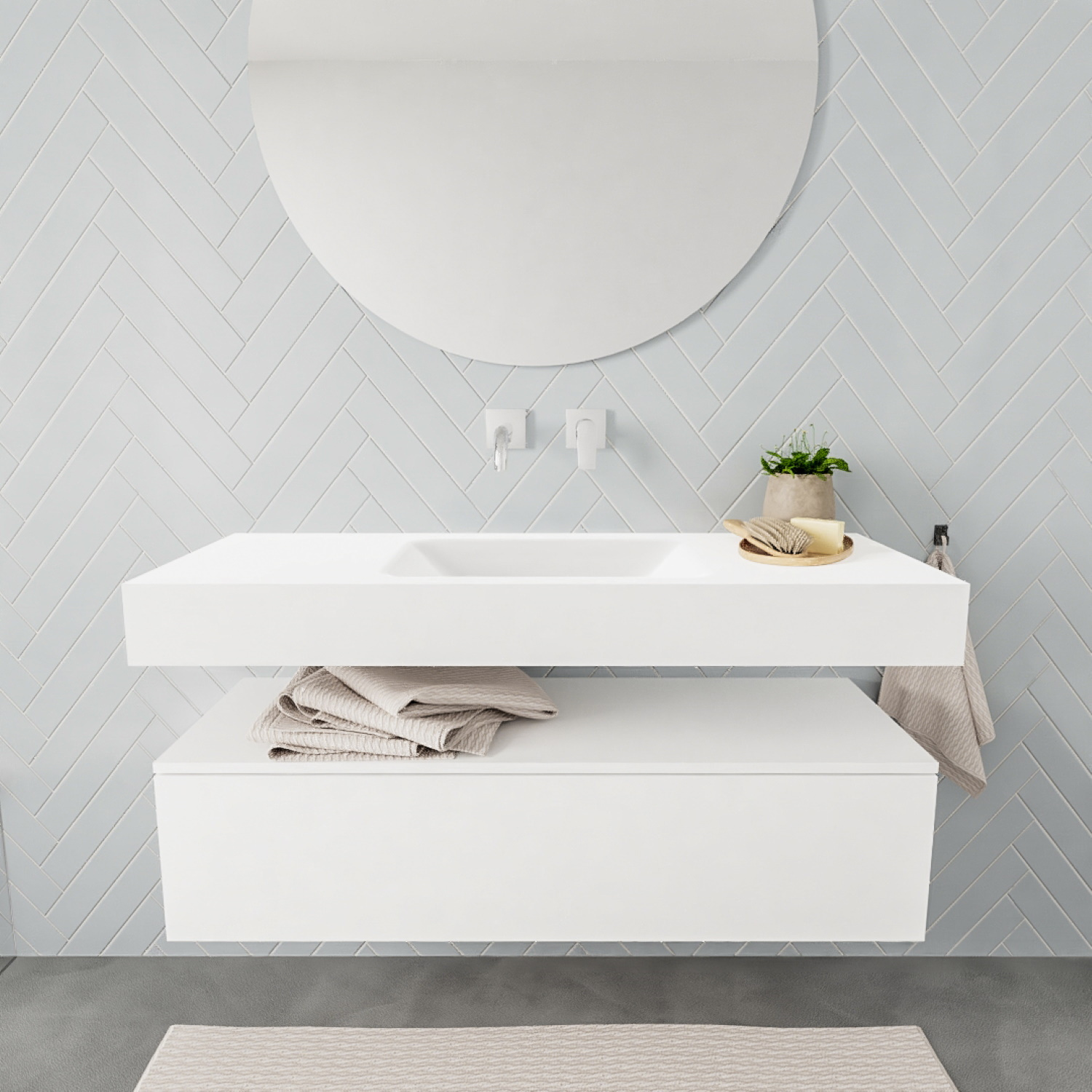 De bijpassende onderkast heeft, net als de wastafel, een afwerking in een mat witte kleur. De onderkast beschikt over een soft-close lade waarin u diverse badkamerartikelen kunt bewaren. Het betreft een lade die greeploos is waardoor deze onderkast een zeer strak en modern design heeft. Dit badmeubel is leverbaar in acht verschillende varianten. U kunt ervoor kiezen om de spoelbak links, in het midden of aan de rechterkant van het meubel te hebben. Ook is de wastafel leverbaar met twee spoelbakken. Verder is de wastafel leverbaar zonder kraangat, met kraangat en met twee kraangaten (alleen bij de dubbele spoelbak).