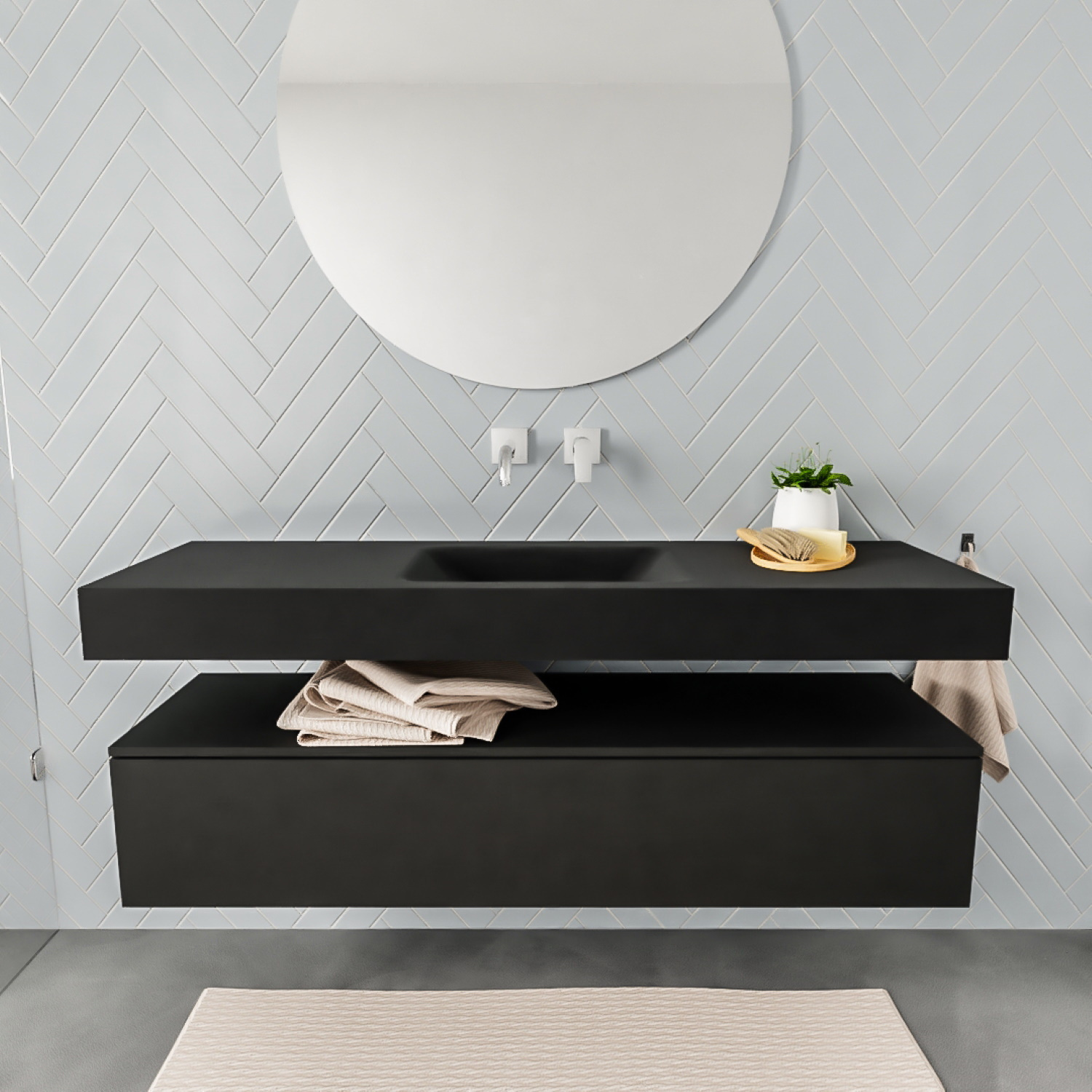 De bijpassende onderkast heeft, net als de wastafel, een afwerking in een mat zwarte kleur. De onderkast beschikt over een soft-close lade waarin u diverse badkamerartikelen kunt bewaren. Het betreft een lade die greeploos is waardoor deze onderkast een zeer strak en modern design heeft. Dit badmeubel is leverbaar in acht verschillende varianten. U kunt ervoor kiezen om de spoelbak links, in het midden of aan de rechterkant van het meubel te hebben. Ook is de wastafel leverbaar met twee spoelbakken. Verder is de wastafel leverbaar zonder kraangat, met kraangat en met twee kraangaten (alleen bij de dubbele spoelbak).