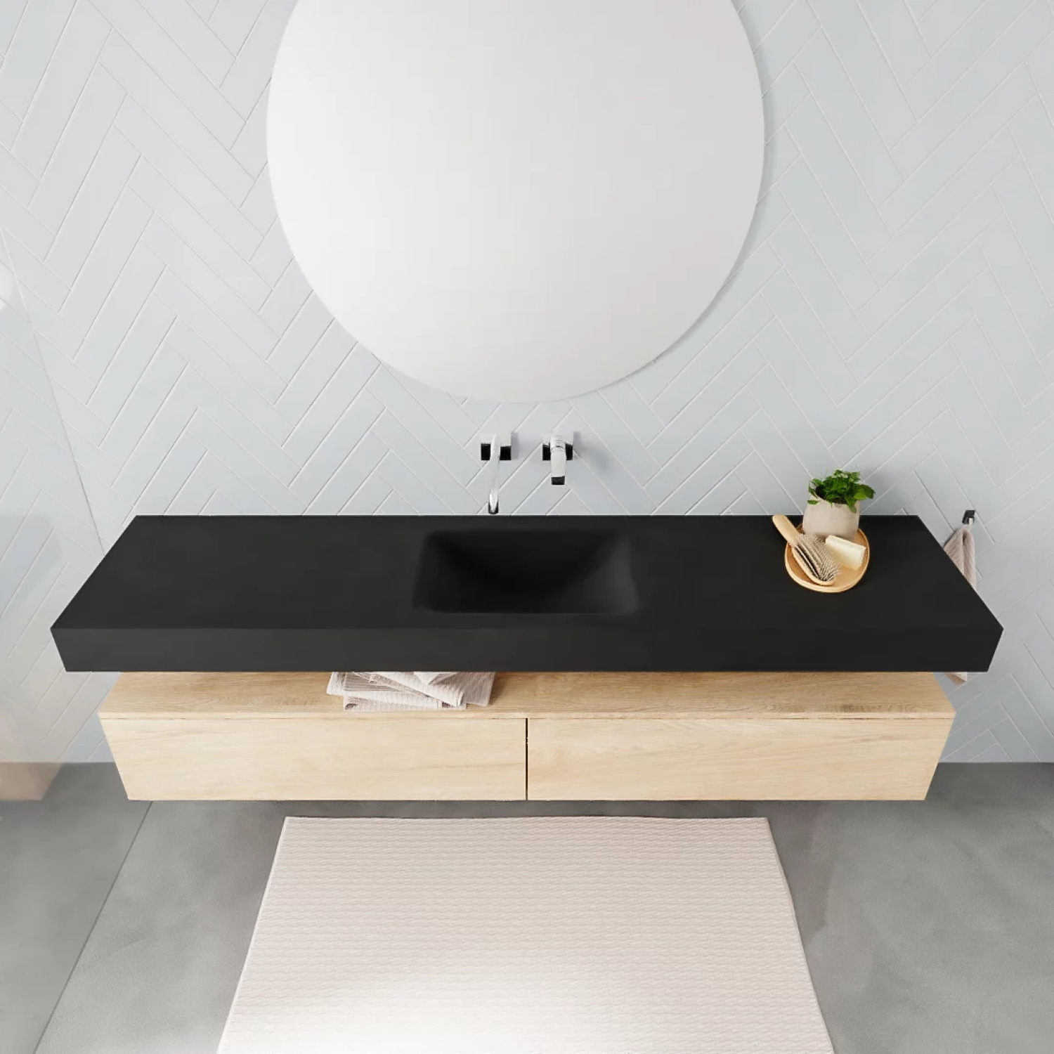 De bijpassende onderkast heeft een afwerking in de kleur washed oak (hout), terwijl de wastafel een mat zwarte kleur heeft. De onderkast beschikt over twee soft-close lades waarin u diverse badkamerartikelen kunt bewaren. Het betreffen lades die greeploos zijn waardoor deze onderkast een zeer strak en modern design heeft. Dit badmeubel is leverbaar in acht verschillende varianten. U kunt ervoor kiezen om de spoelbak links, in het midden of aan de rechterkant van het meubel te hebben. Ook is de wastafel leverbaar met twee spoelbakken. Verder is de wastafel leverbaar zonder kraangat, met kraangat en met twee kraangaten (alleen bij de dubbele spoelbak).