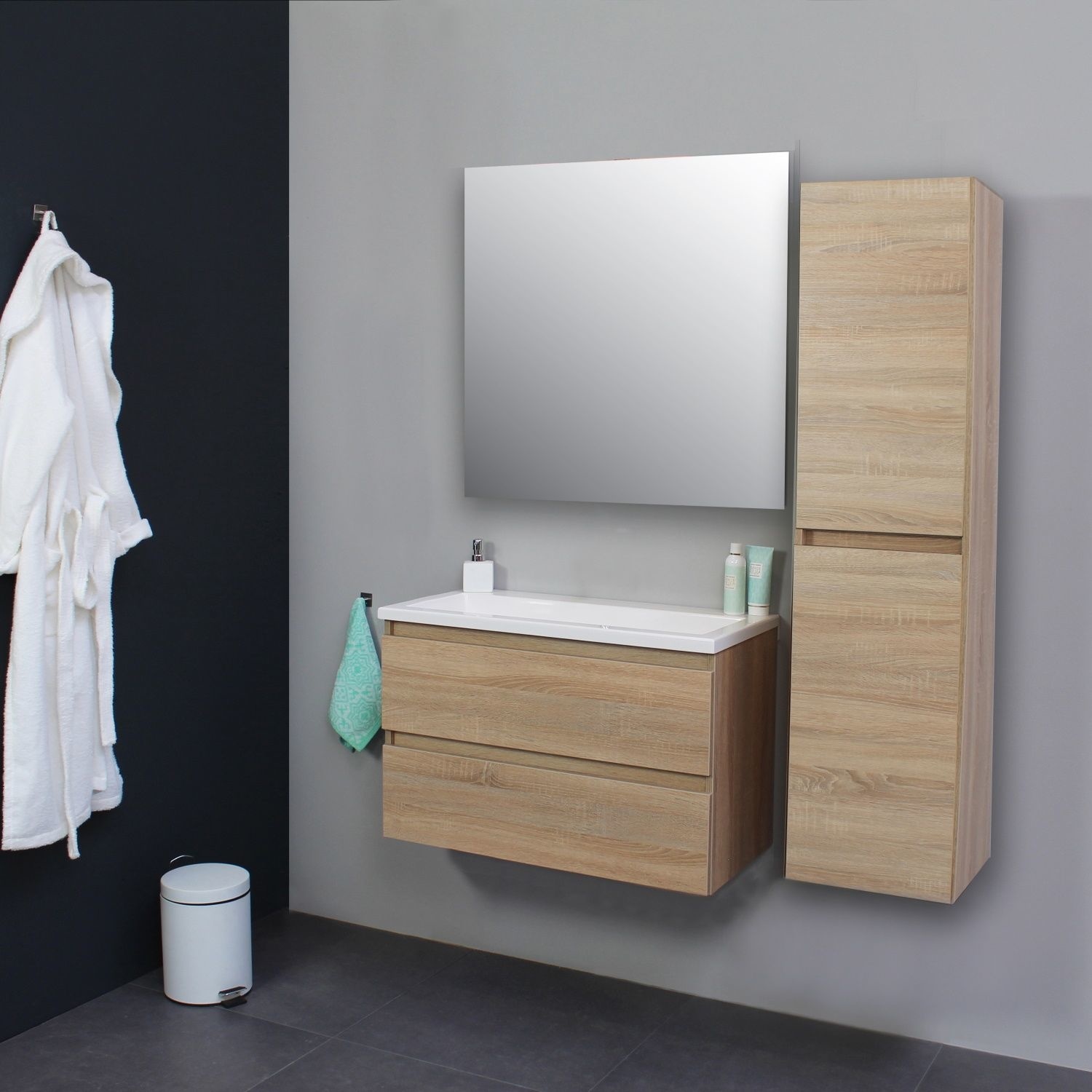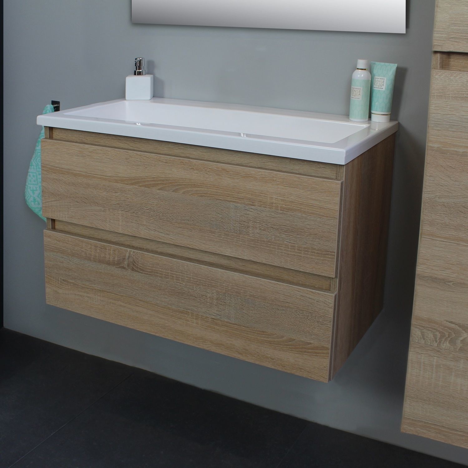Dit prachtige badmeubel van Boss & Wessing, beschikt over een eiken kleurige onderkast met een wastafel van acryl. De wastafel wordt geleverd zonder kraangat, maar wilt u toch beschikken over een kraan, kunt u kiezen voor de aanschaf van een inbouw kraan. Het badmeubel heeft een breedte van 80 cm, een hoogte van 55 cm en een diepte van 46 cm. De set is in meerdere afmetingen en verschillende kleuren beschikbaar.