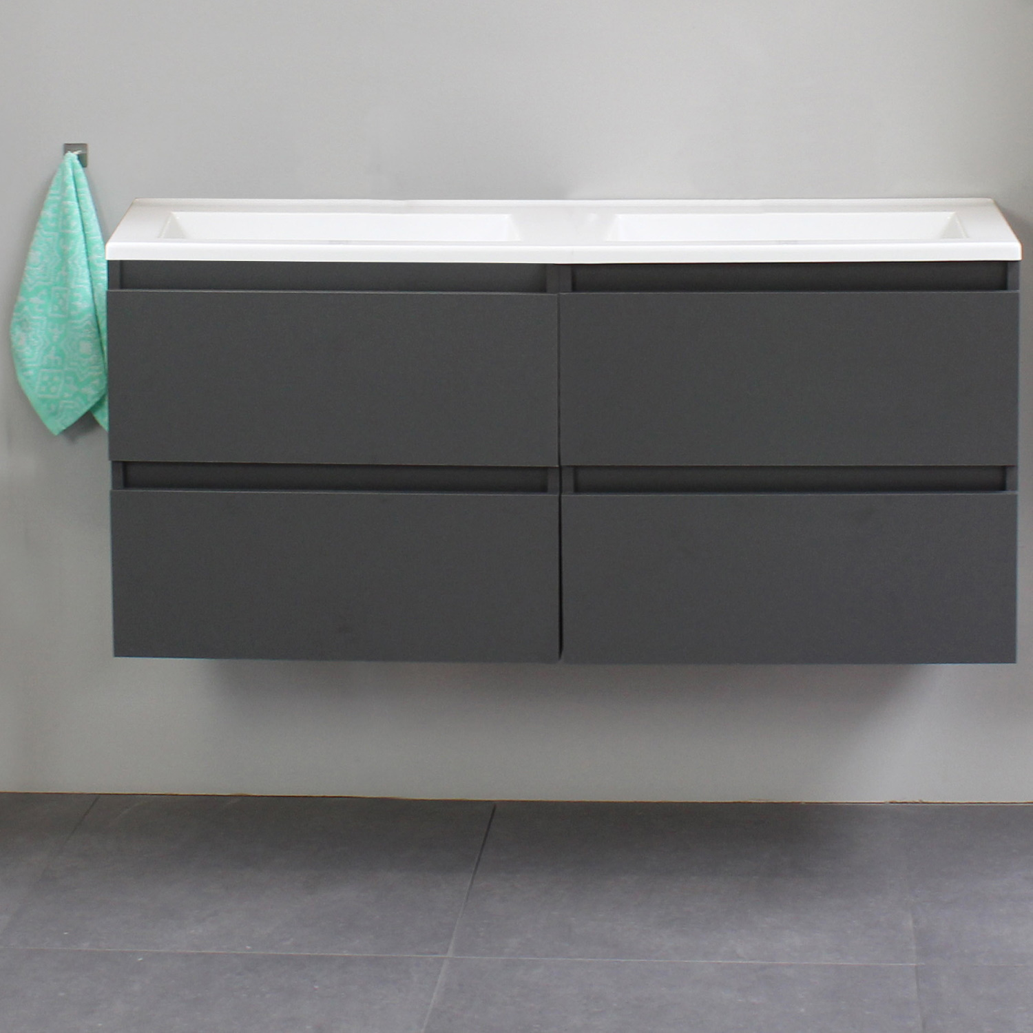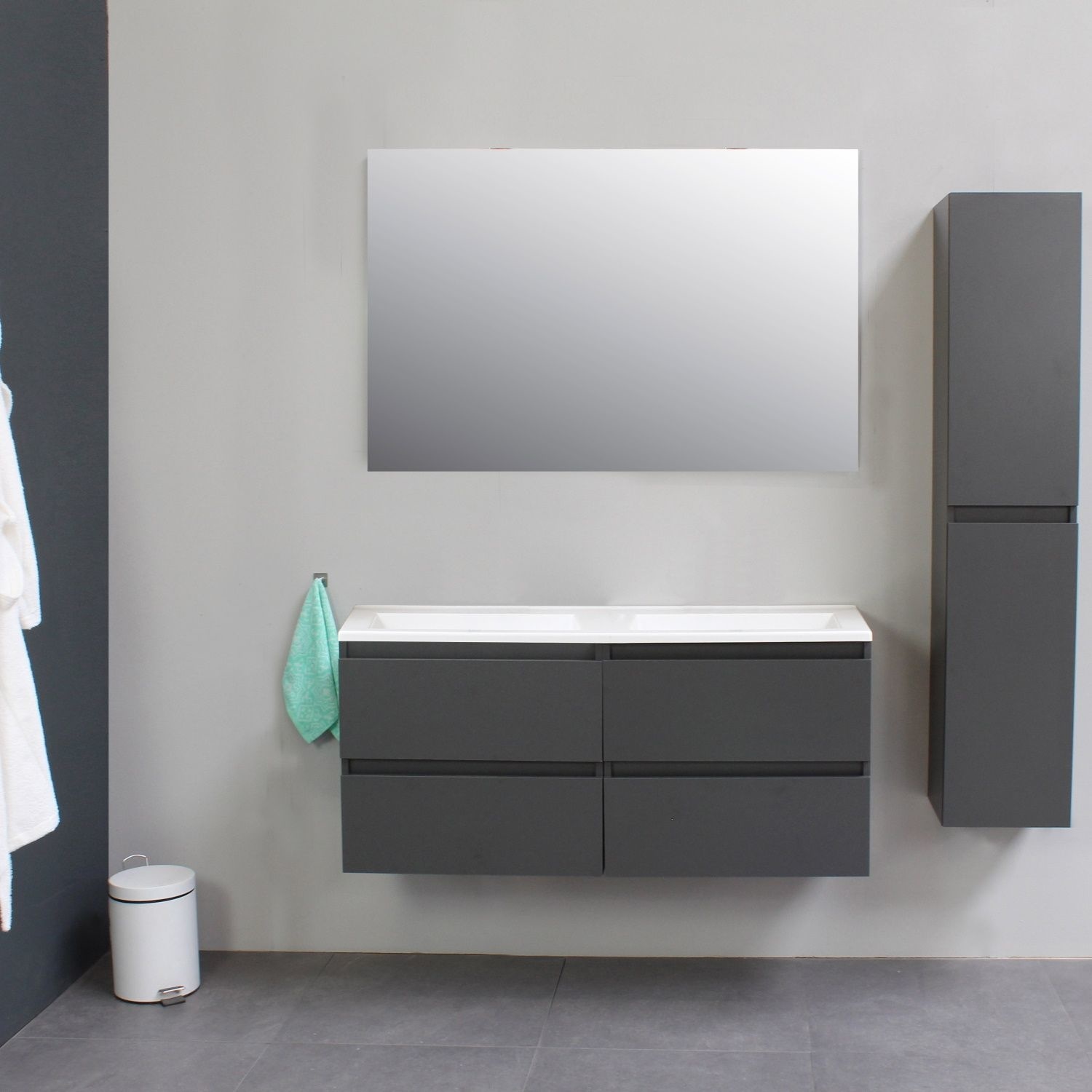 Dit prachtige badmeubel van Boss & Wessing, beschikt over een antraciete onderkast met een wastafel van acryl, en wordt geleverd inclusief spiegel. De wastafel wordt geleverd zonder kraangat, maar wilt u toch beschikken over een kraan, kunt u kiezen voor de aanschaf van een inbouw kraan. Het badmeubel heeft een breedte van 120 cm, een hoogte van 55 cm en een diepte van 46 cm. De set is in meerdere afmetingen en verschillende kleuren beschikbaar.