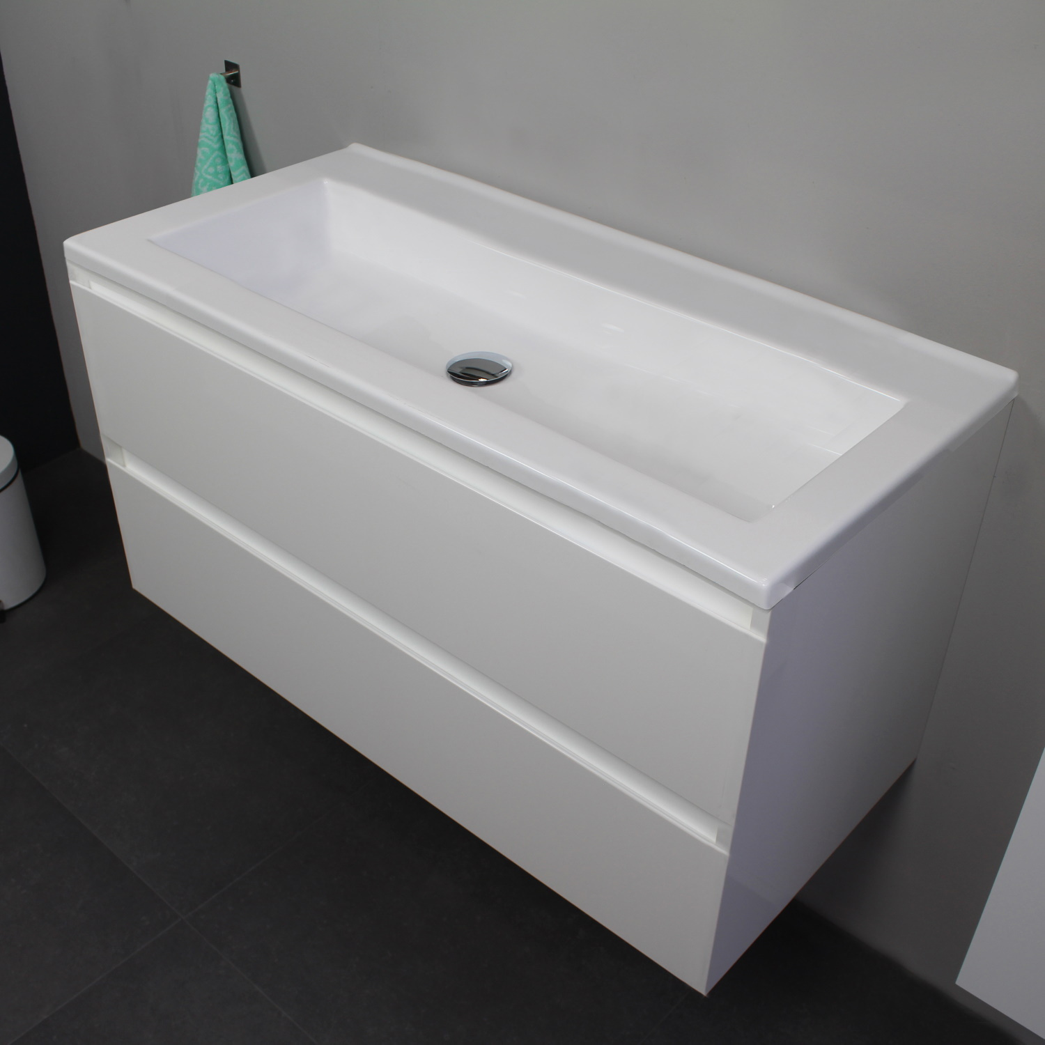 Dit prachtige badmeubel van Boss & Wessing, beschikt over een wit kleurige onderkast met een wastafel van acryl. De wastafel wordt geleverd zonder kraangat, maar wilt u toch beschikken over een kraan, kunt u kiezen voor de aanschaf van een inbouw kraan. Het badmeubel heeft een breedte van 100 cm, een hoogte van 55 cm en een diepte van 46 cm. De set is in meerdere afmetingen en verschillende kleuren beschikbaar.