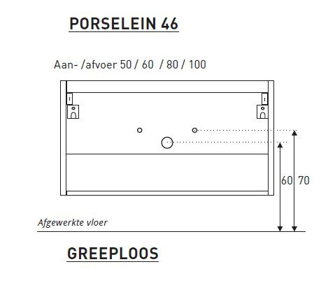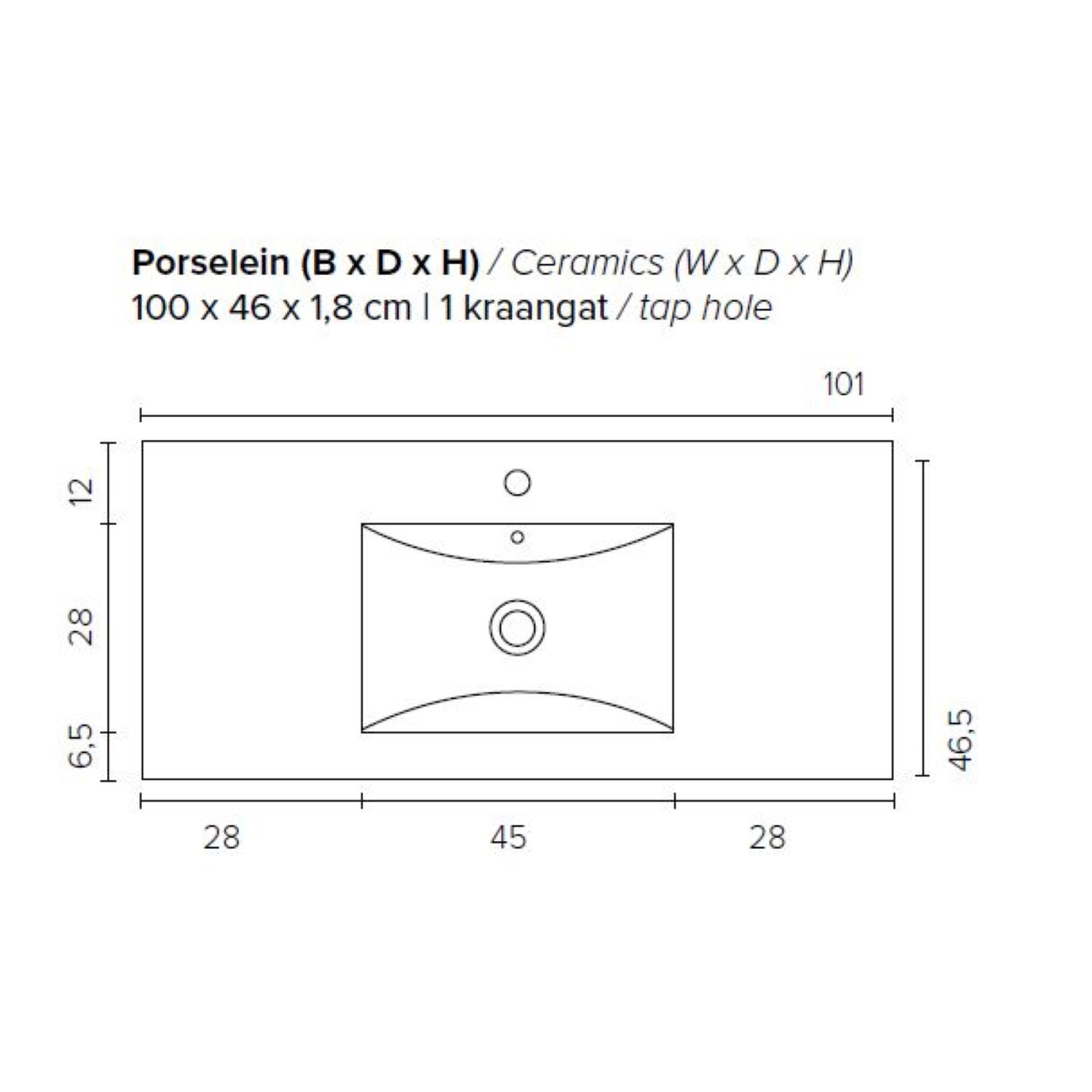 De afmetingen van de onderkast met wastafel zijn: 100 cm in de breedte, 55 cm in de hoogte en een diepte van 46 cm. De set is in meerdere afmetingen en verschillende kleuren beschikbaar.