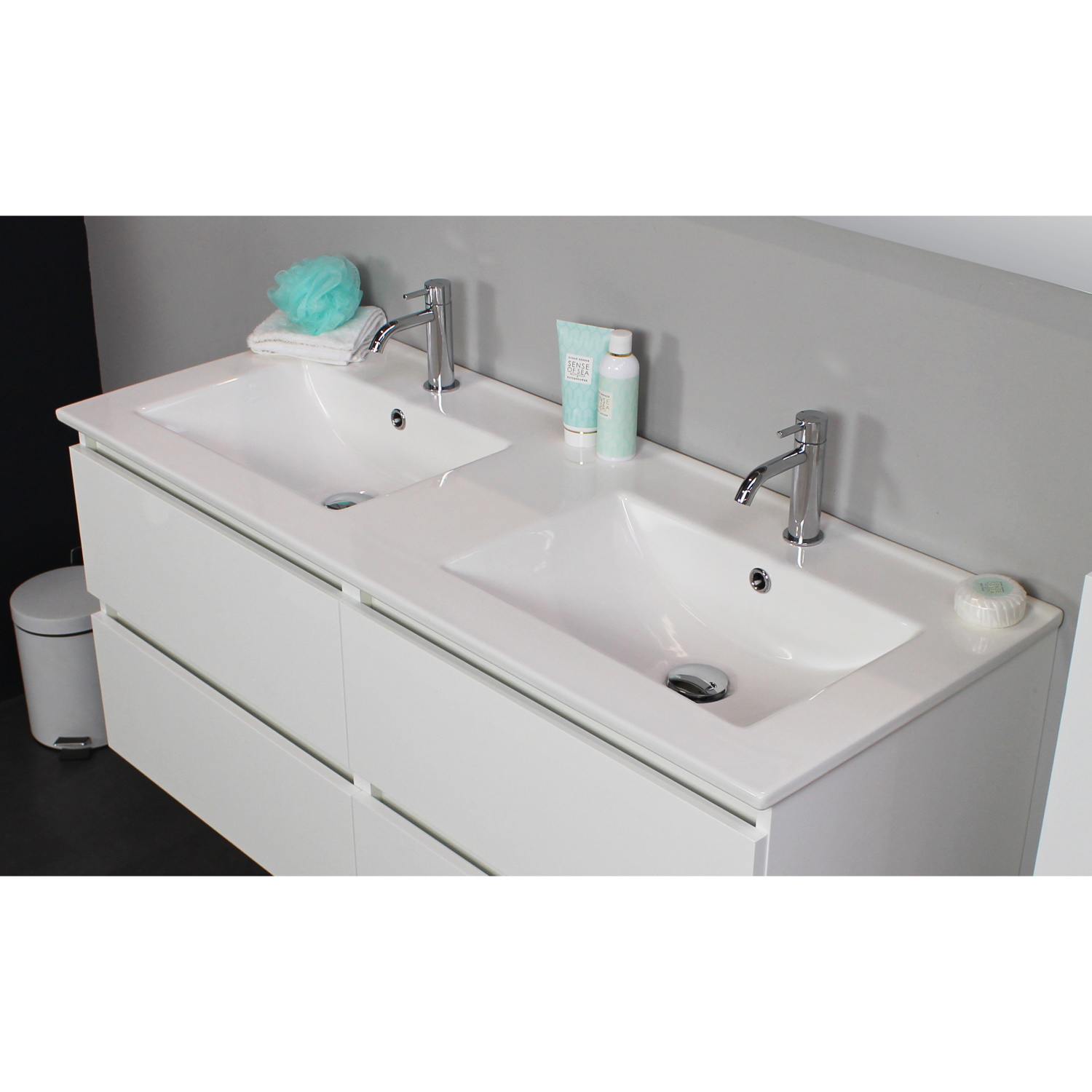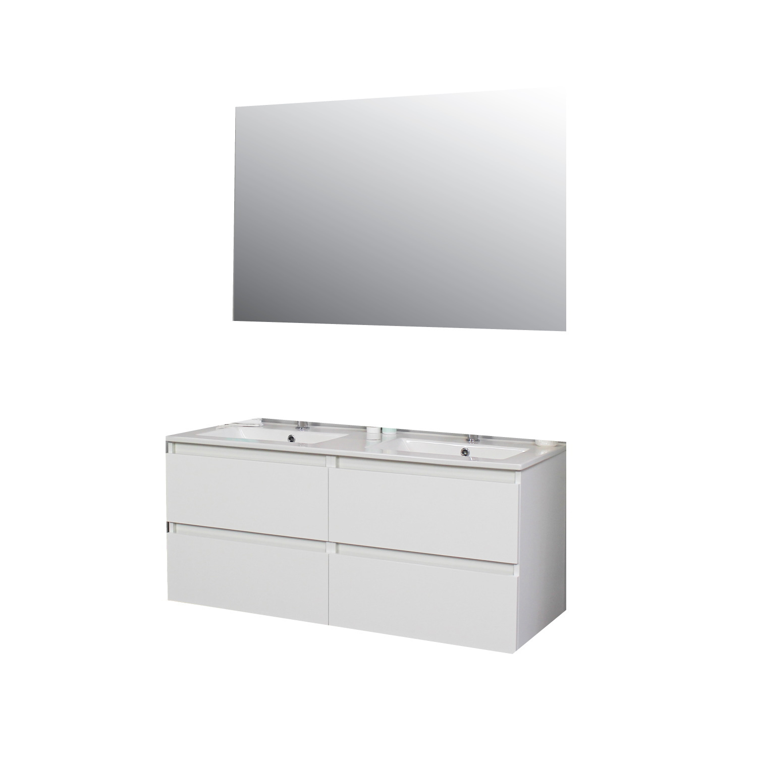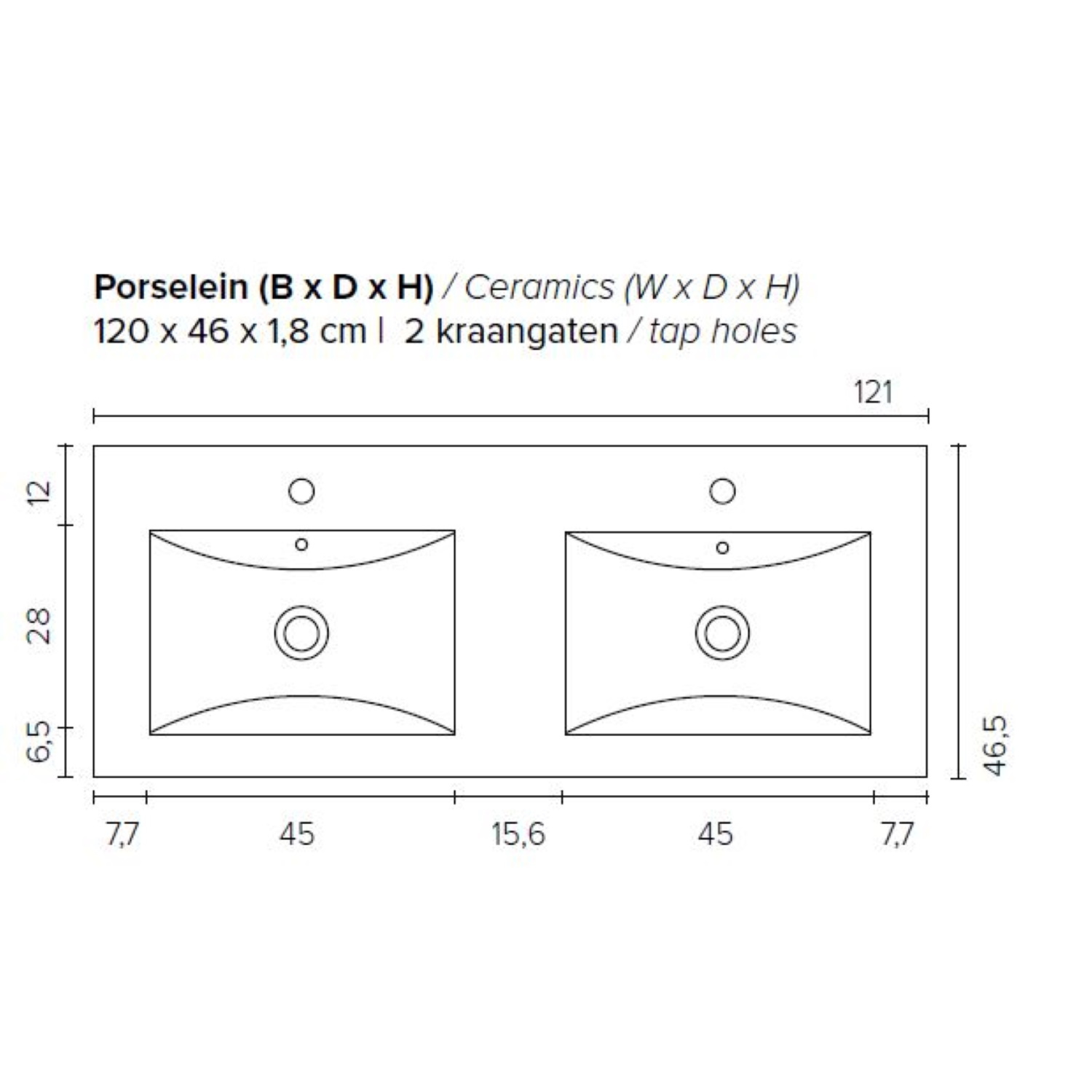 Omdat de wastafel beschikt over 2 kraangaten heeft u de optie om een opbouwkranen toe te voegen aan uw wastafel (tegen een meerprijs). Doordat de wastafel beschikt over 2 kraangaten, hoeft u niet op uw beurt te wachten en kunt gemakkelijk tegelijkertijd uw handen wassen. Het badmeubel heeft een breedte van 120 cm, een hoogte van 55 cm en een diepte van 46 cm. De set is verkrijgbaar in meerdere afmetingen en kleuren en wordt geleverd inclusief spiegel.