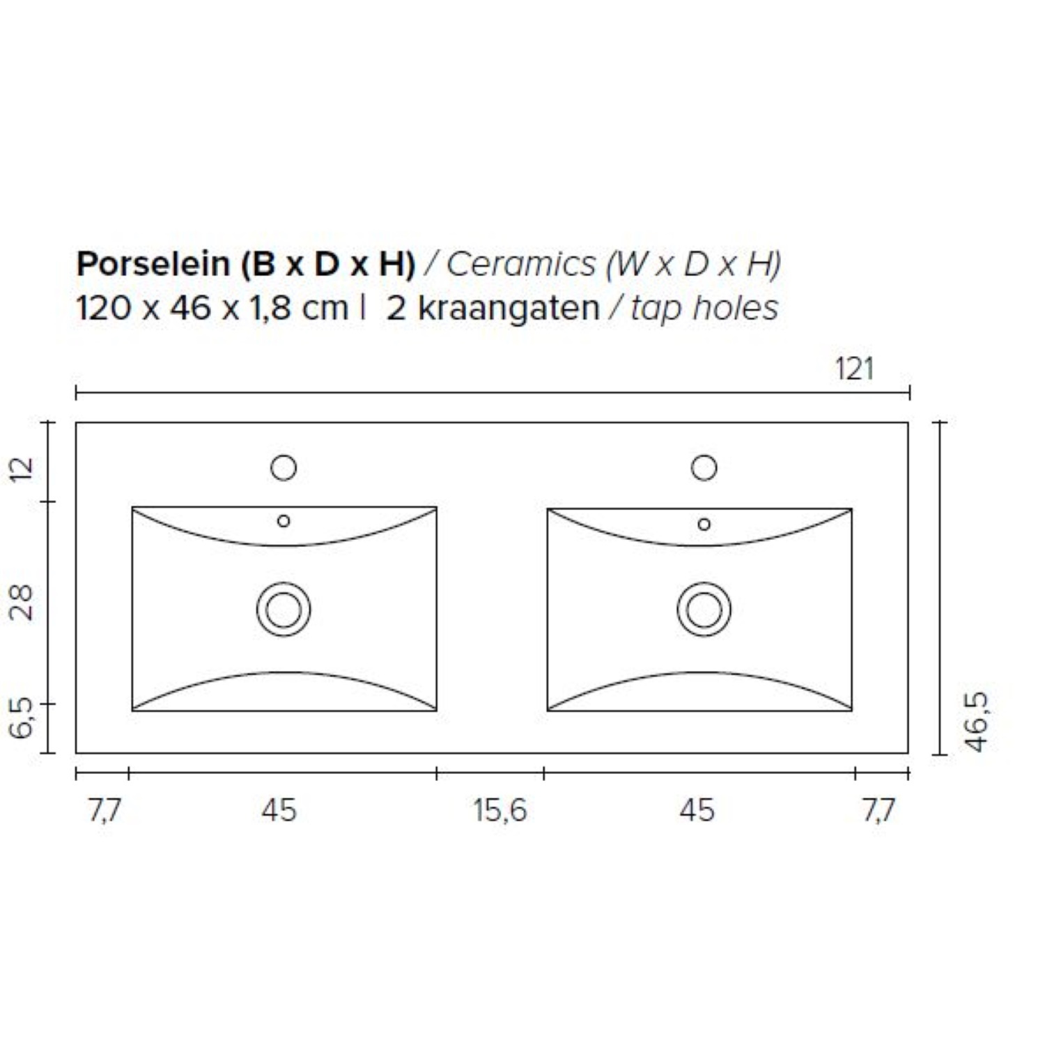 Omdat de wastafel beschikt over 2 kraangaten heeft u de optie om een opbouwkranen toe te voegen aan uw wastafel (tegen een meerprijs). Doordat de wastafel beschikt over 2 kraangaten, hoeft u niet op uw beurt te wachten en kunt gemakkelijk tegelijkertijd uw handen wassen. Het badmeubel heeft een breedte van 120 cm, een hoogte van 55 cm en een diepte van 46 cm. De set is verkrijgbaar in meerdere afmetingen en kleuren en wordt geleverd inclusief spiegel.