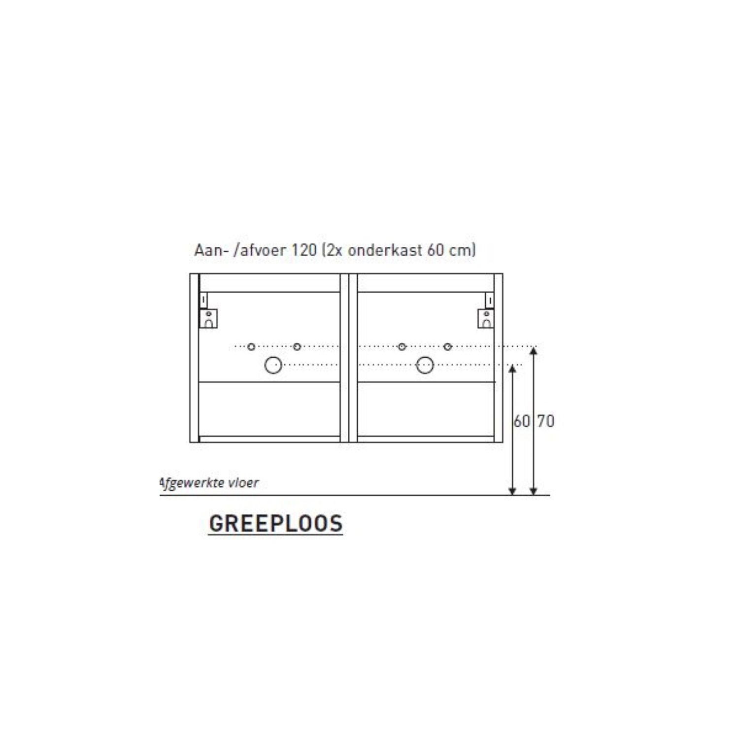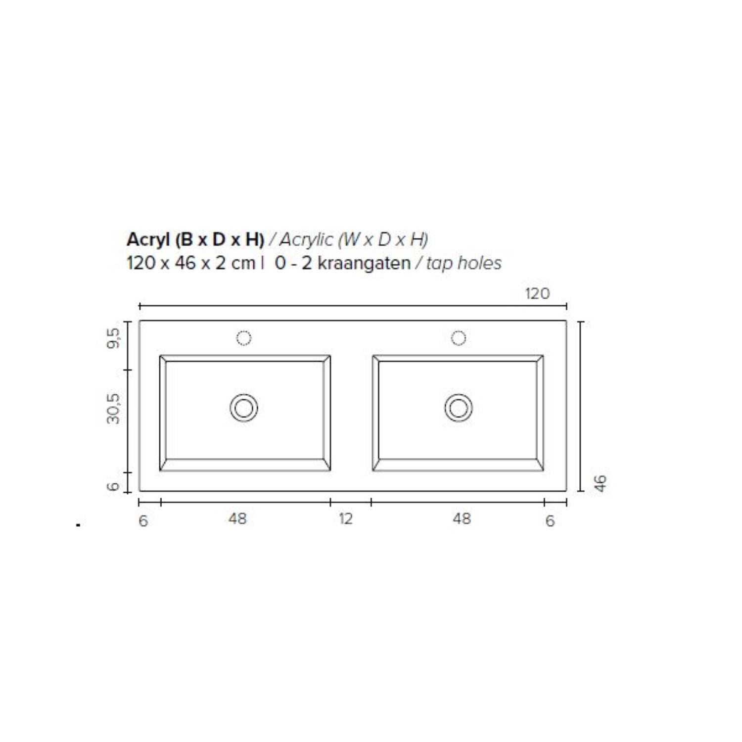 De afmetingen van het badmeubel zijn: 120 cm in de breedte, 55 cm in de hoogte en 46 cm diepte.