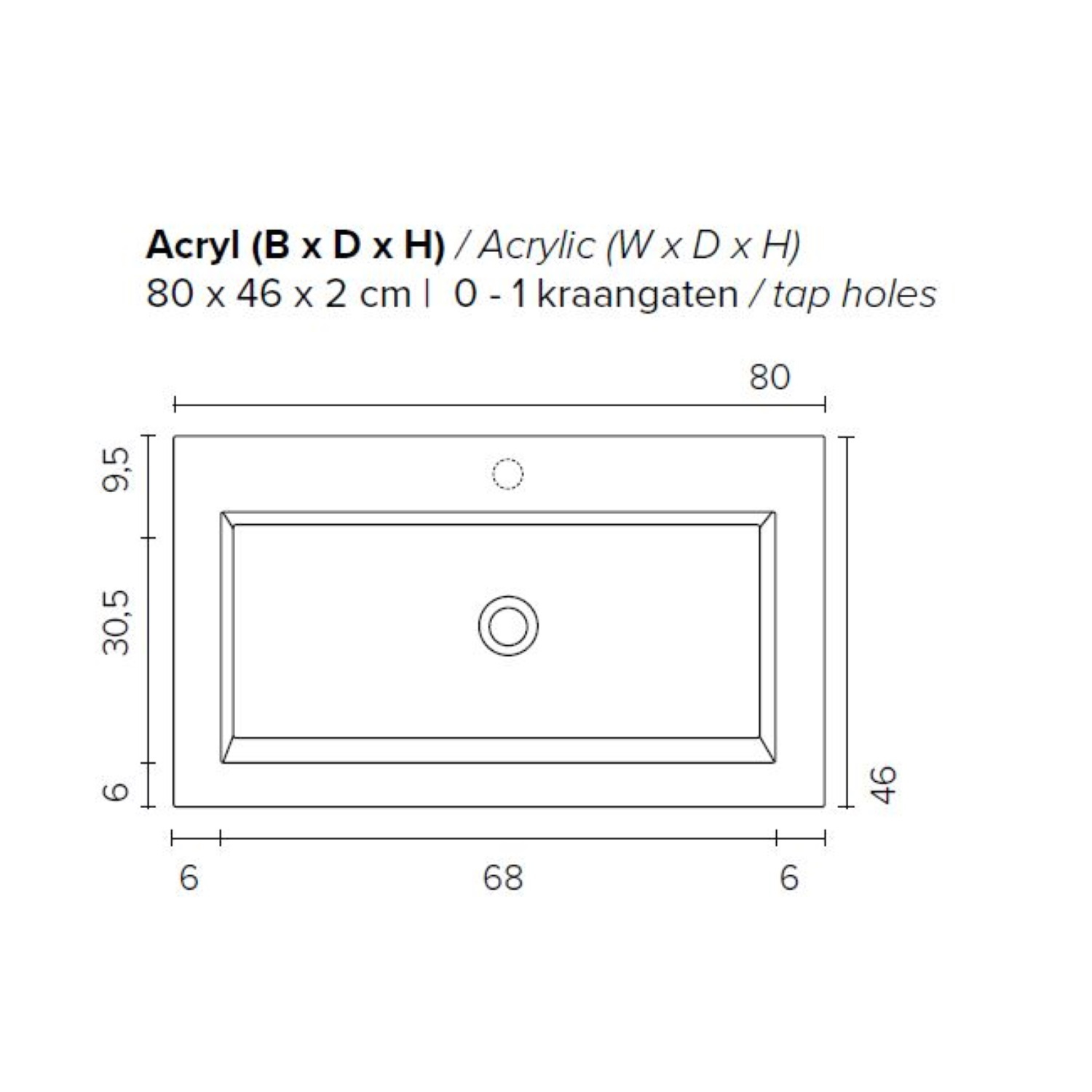 De afmetingen van het badmeubel zijn: 80 cm in de breedte, 55 cm in de hoogte en 46 cm diepte.
