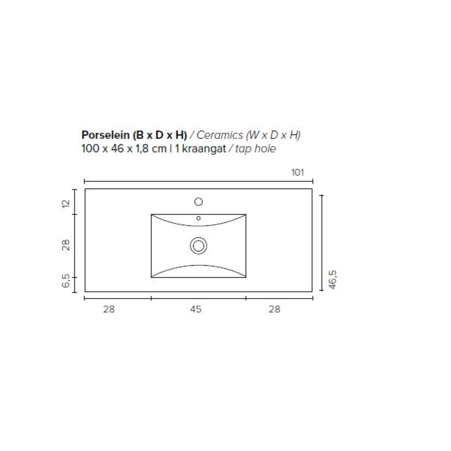De afmetingen van het badmeubel zijn: 100 cm in de breedte, 55 cm in de hoogte en 46 cm diepte.