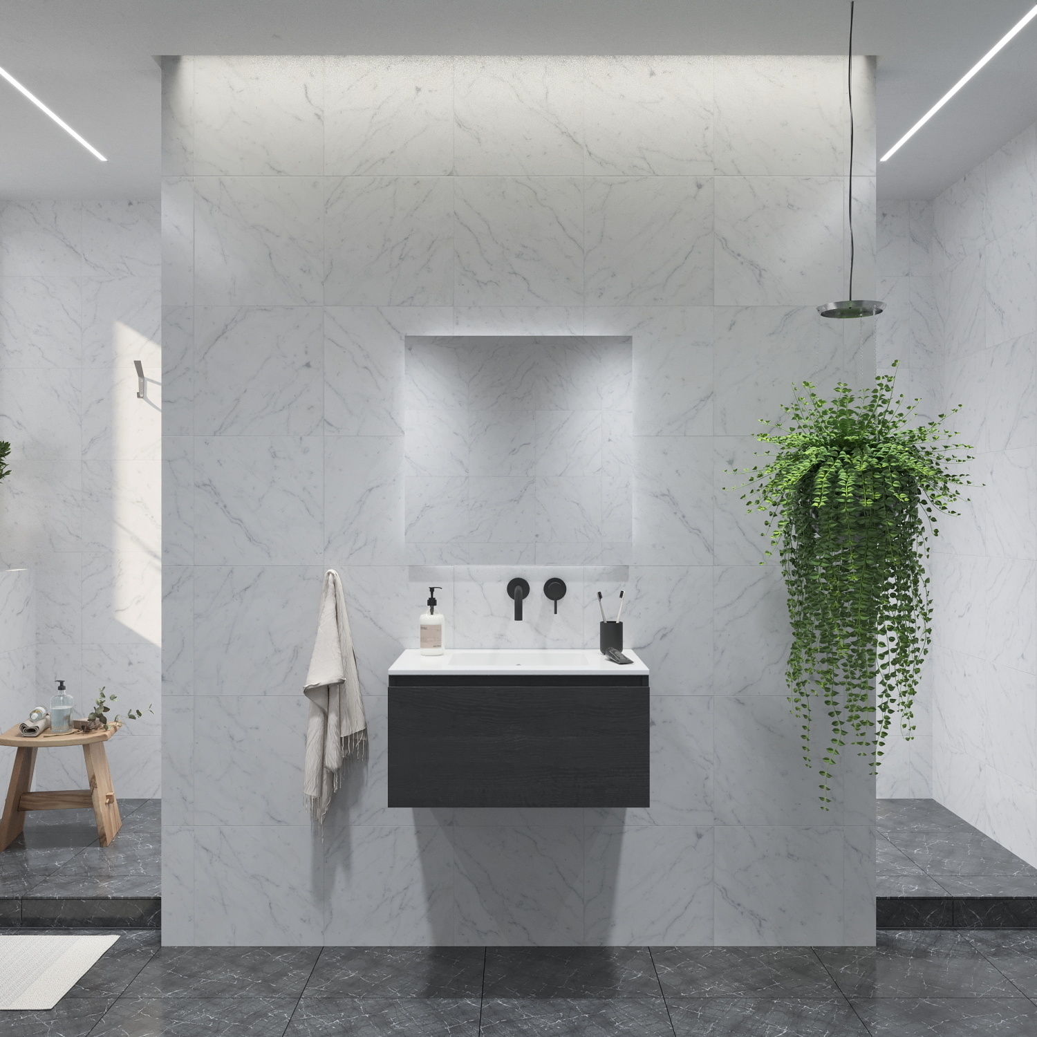 Het badkamermeubel is volledig greeploos, wat bijdraagt aan het strakke design van het meubel.