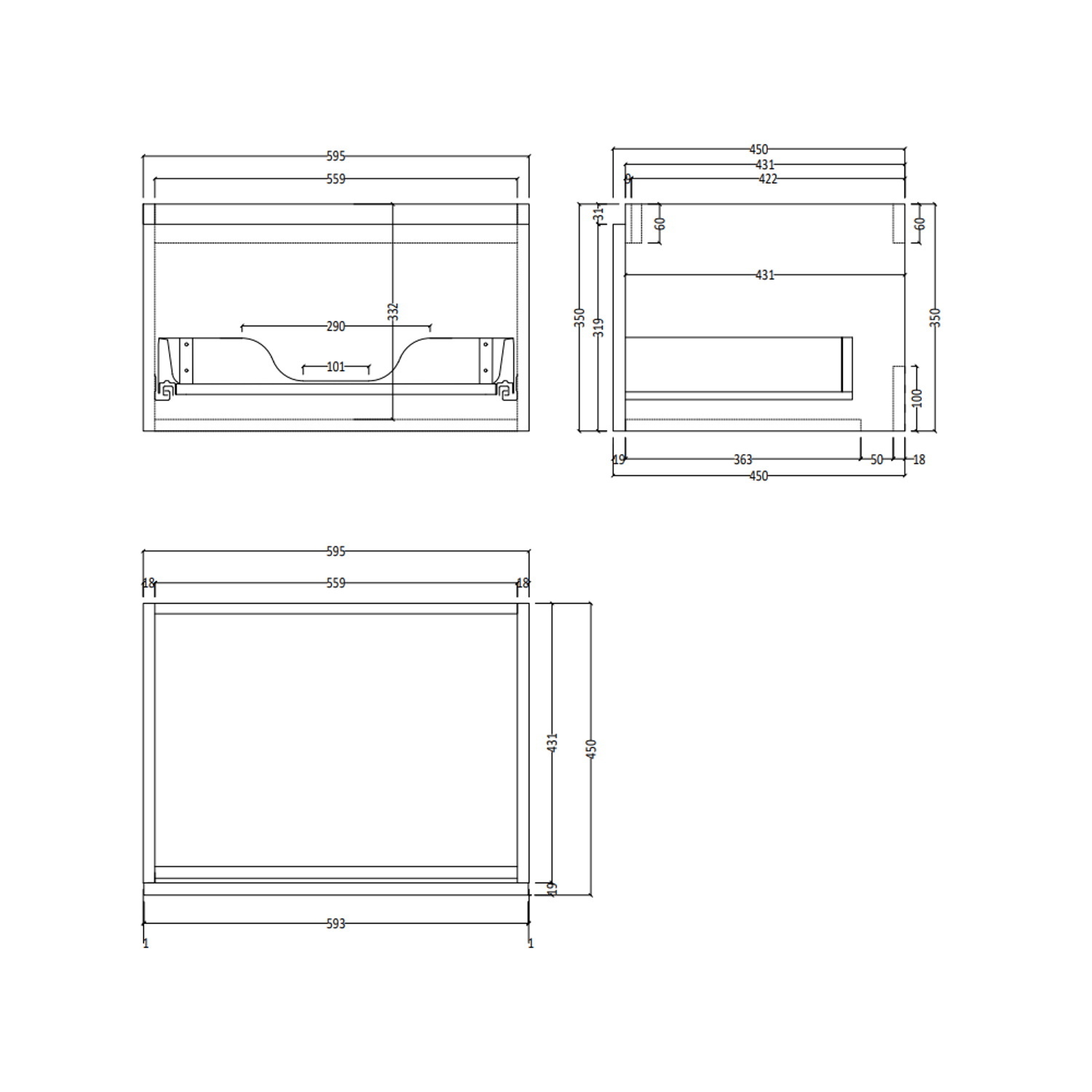 Deze set heeft een breedte van 60 cm, een diepte van 45.5 cm en een hoogte van 55 cm. Het meubel is verkrijgbaar in de kleuren rustiek eiken, zwart eiken, mat wit en mat zwart.