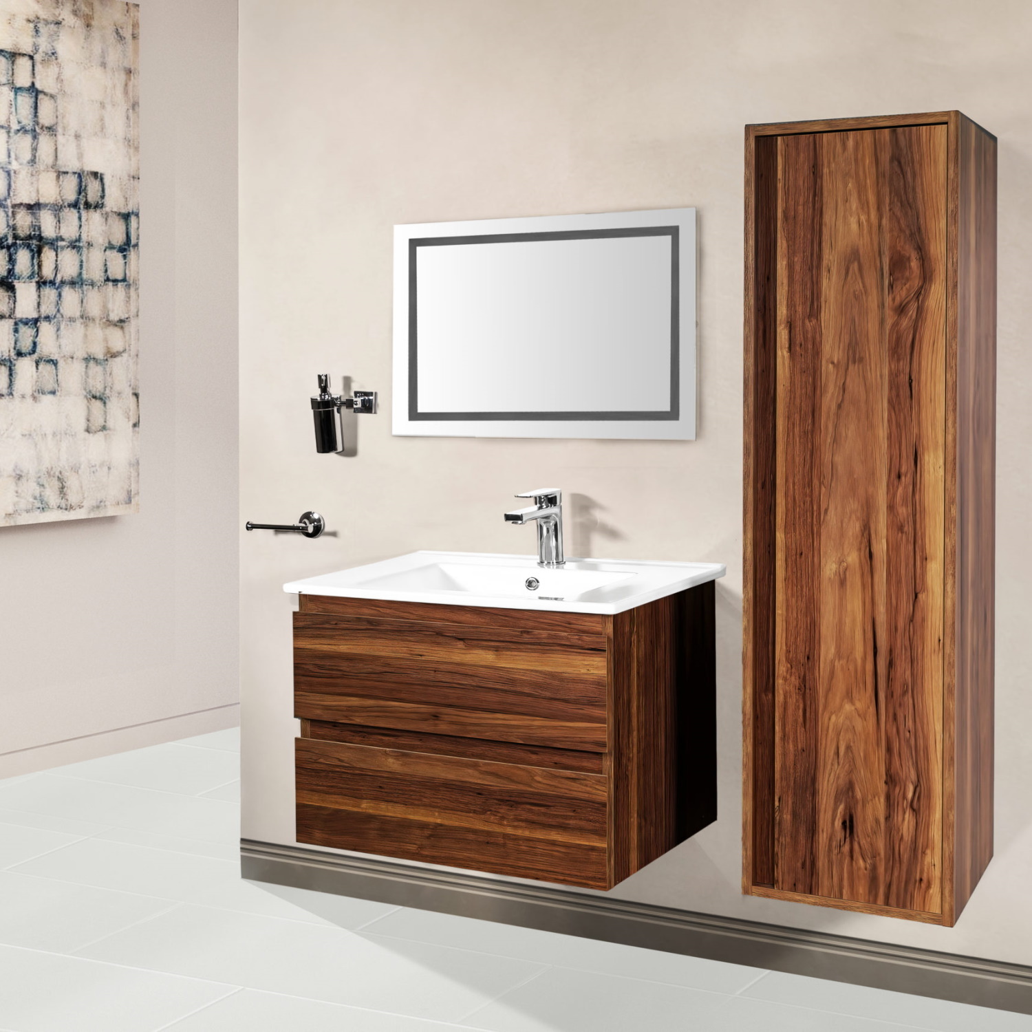 De set maakt u compleet door een bijpassende kolomkast en badkamerspiegel aan uw bestelling toe te voegen voor een meerprijs. De kolomkast heeft eveneens een afwerking in de kleur donker eiken en is leverbaar in hoogtes van 135 en 160 cm. Tot slot heeft u de keuze uit drie verschillende spiegels die qua afmeting overeen komen met de onderkast en de wastafel.