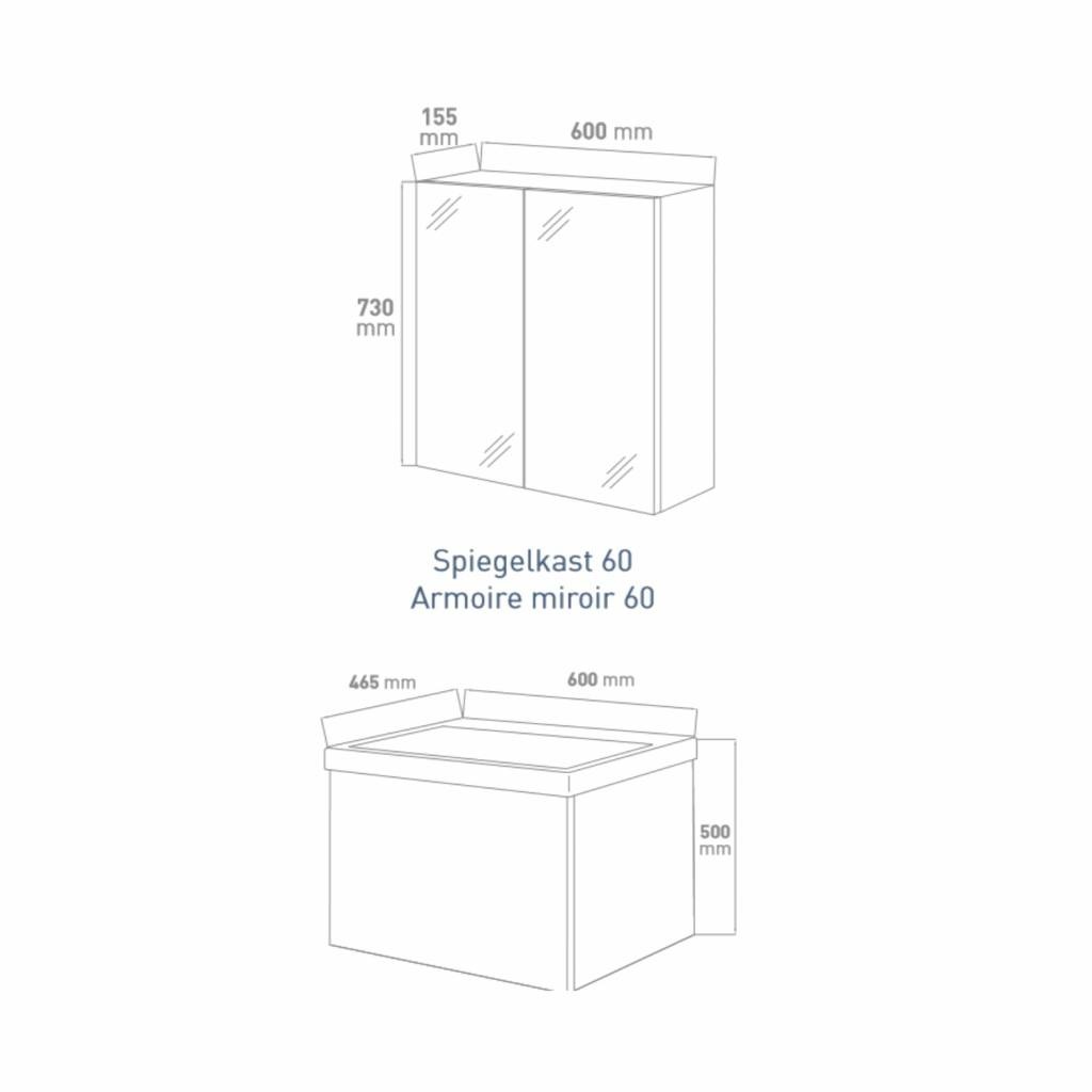De spiegelkast is ook gemaakt van melamine en afgewerkt met een hoogglans witte laklaag. De deuren hebben een enkelzijdige spiegel van 60x73x15.5cm. De mooie spiegelkast is voorzien van opbouw verlichting dat mooi naar beneden schijnt. Zo kunt u alles goed zien in de spiegel. Verlichting dat er bij zit is een IP44, LED lamp 6W.