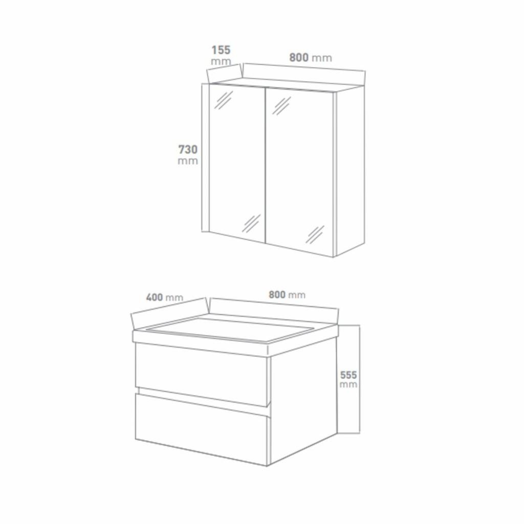 De spiegelkast is ook gemaakt van melamine en afgewerkt met een hoogglans antraciete laklaag. De deuren hebben een enkelzijdige spiegel van 73x80x15.5cm. De mooie spiegelkast is voorzien van opbouw verlichting dat mooi naar beneden schijnt. Zo kunt u alles goed zien in de spiegel. Verlichting dat is bij zit is een IP44 halogeen lamp LED 6W.