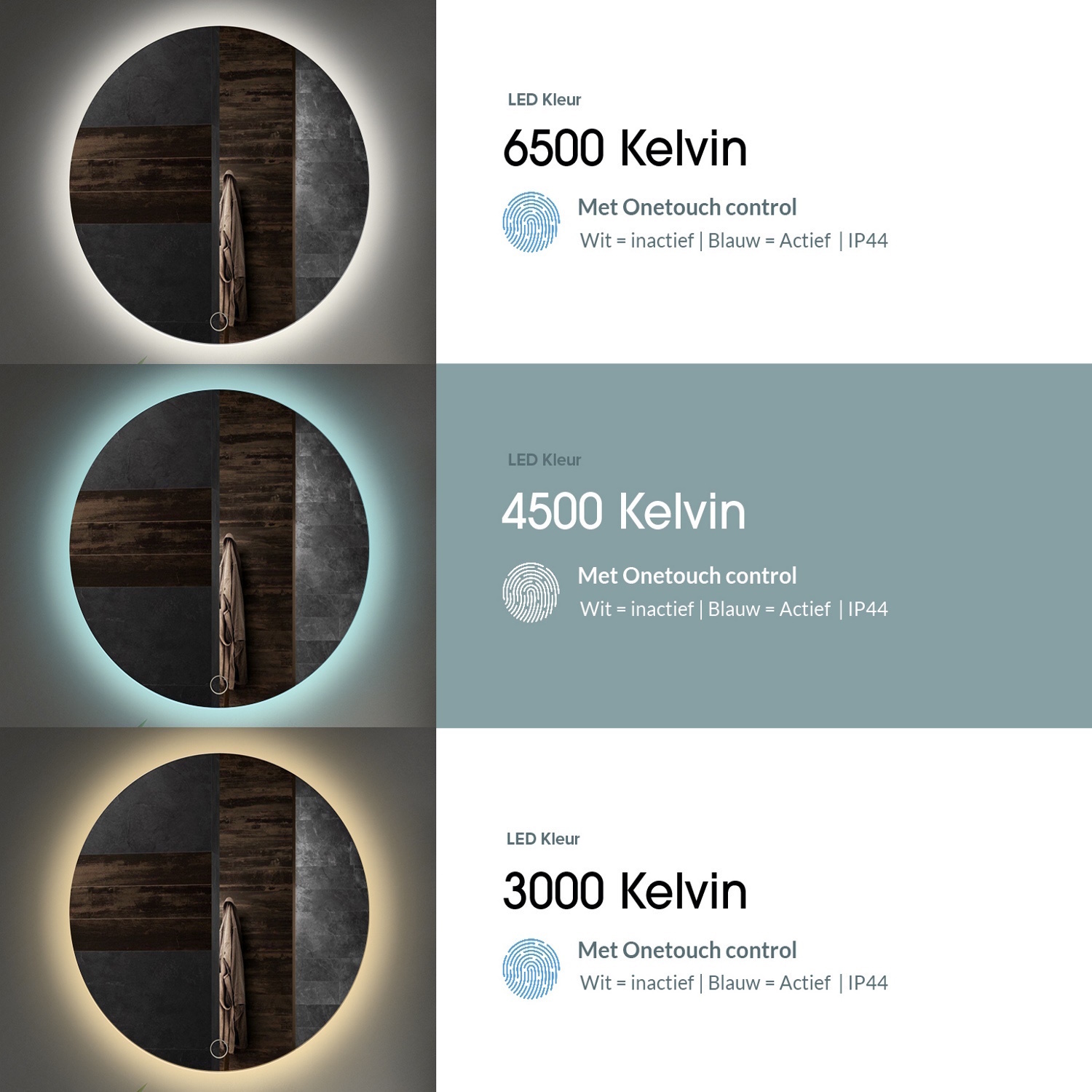 De verlichting is in 3 kleuren led van 2000 t/m 6000 Kelvin en dimbaar. De verlichting is in 3 kleuren led van 2000 t/m 10000 Kelvin en dimbaar. De spiegel is dimbaar in de tinten 3000k,42000 K en 6500 K. We raden 3000 Kelvin aan als u een ontspannen sfeer in de badkamer wilt creëeren. Wilt u beter zicht hebben dan is 4200 of 6500 Kelvin vaak prettiger om mee te werken. Dit zijn wat koelere en wittere kleuren dan 3000K. De spiegel is 100 cm breed, heeft een hoogte van 100 cm en een glasdikte van 4 mm. Verder bevat de spiegel 2 touch knoppen waarmee u de verlichting en verwarming eenvoudig kunt bedienen. De spiegel is voorzien van geintegreerde spiegelverwarming, deze is met de tweede touch knop te bedienen. Wanneer de verlichting is uitgeschakeld, licht de touch button blauw op.