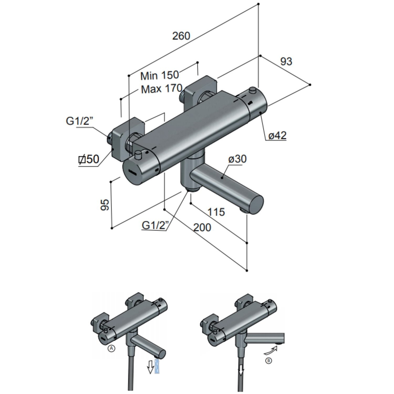 De kraan is 26 cm breed en komt 20 cm van de muur af. De uitloop heeft een diameter van 3 cm en is 11.5 cm. De aansluiting voor de doucheslang is een 1/2" aansluiting. Zo ook de aansluitingen op de waterleidingen.