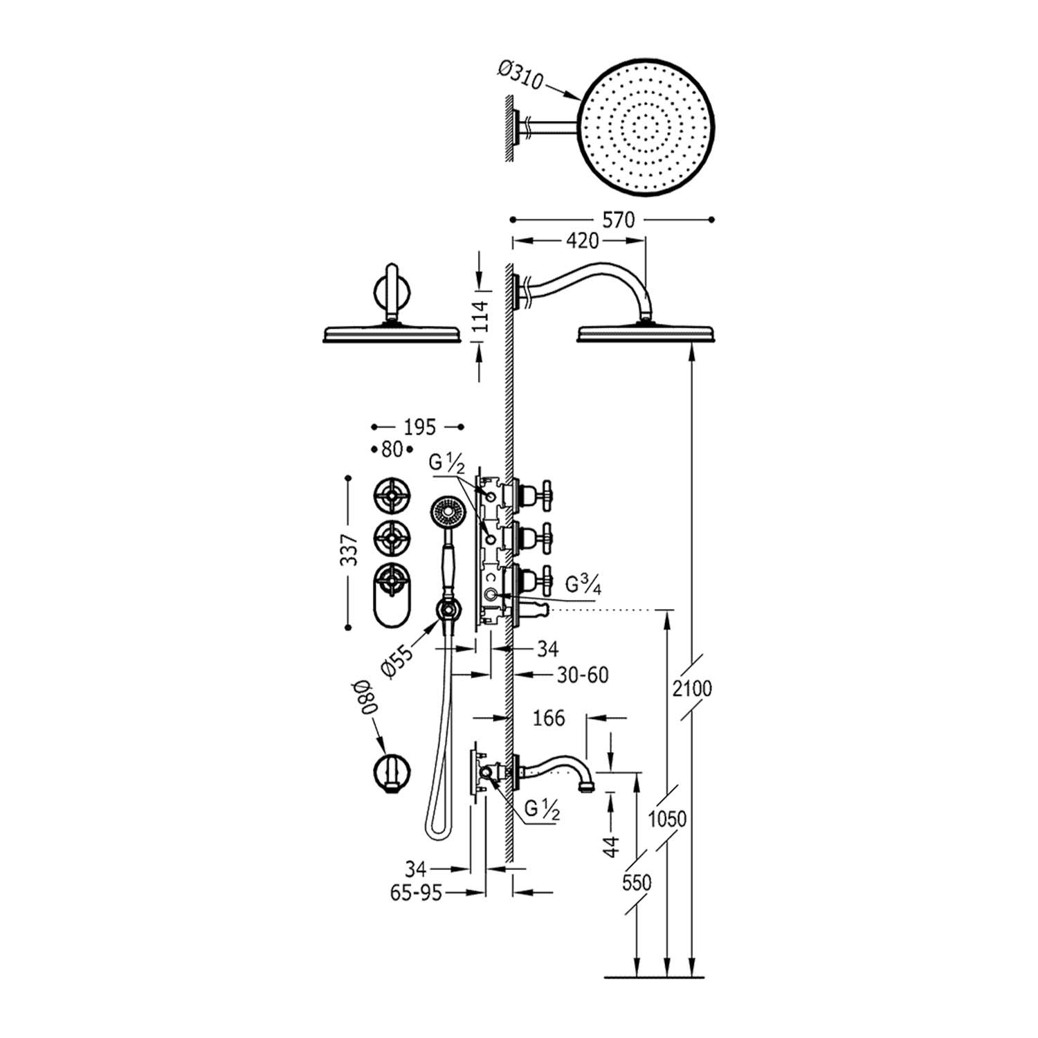 De kraan is voorzien van 3 kruisgrepen. De set is voorzien van antikalk handdouche waardoor deze makkelijk schoon te maken is. De handdouche heeft een wit keramisch handvat wat een mooi klassieke look geeft aant de kraan. De kraan heeft een uitloop van 16.6 cm en een aansluiting 1/2". De regendouche komt inclusief wandarm en heeft een diameter van 31 cm.