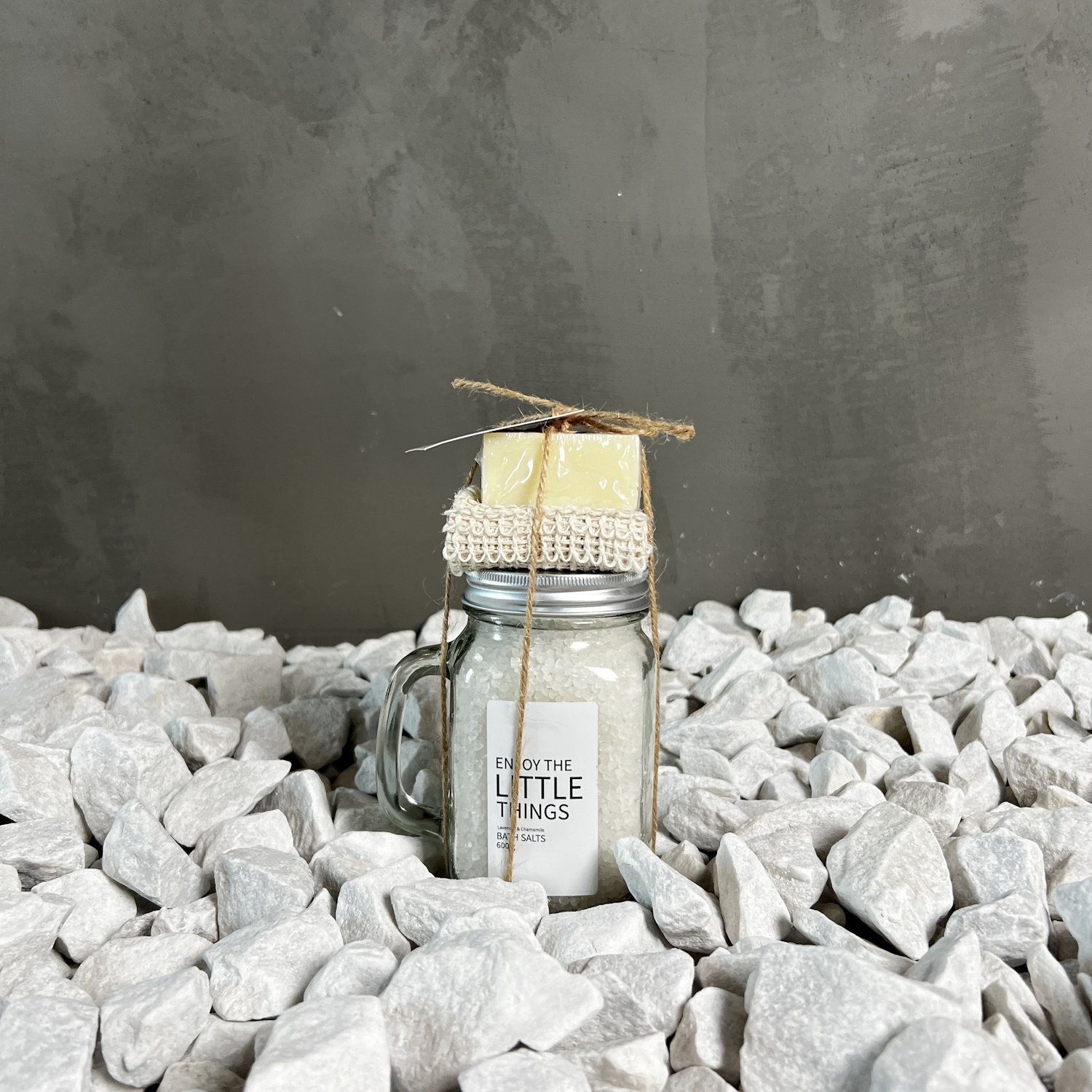 Deze Badkristallen in glas met Zeep is van het merk AQS en komt uit de serie Wellness. De badkristallen zit samen met een stuk zeep en ee washanje/handdoekje in een jute touwtje ingepakt. Deze set kan heel erg leuk om in zowel de toiletruimte als de badkamer neer te zetten ter decoratie.