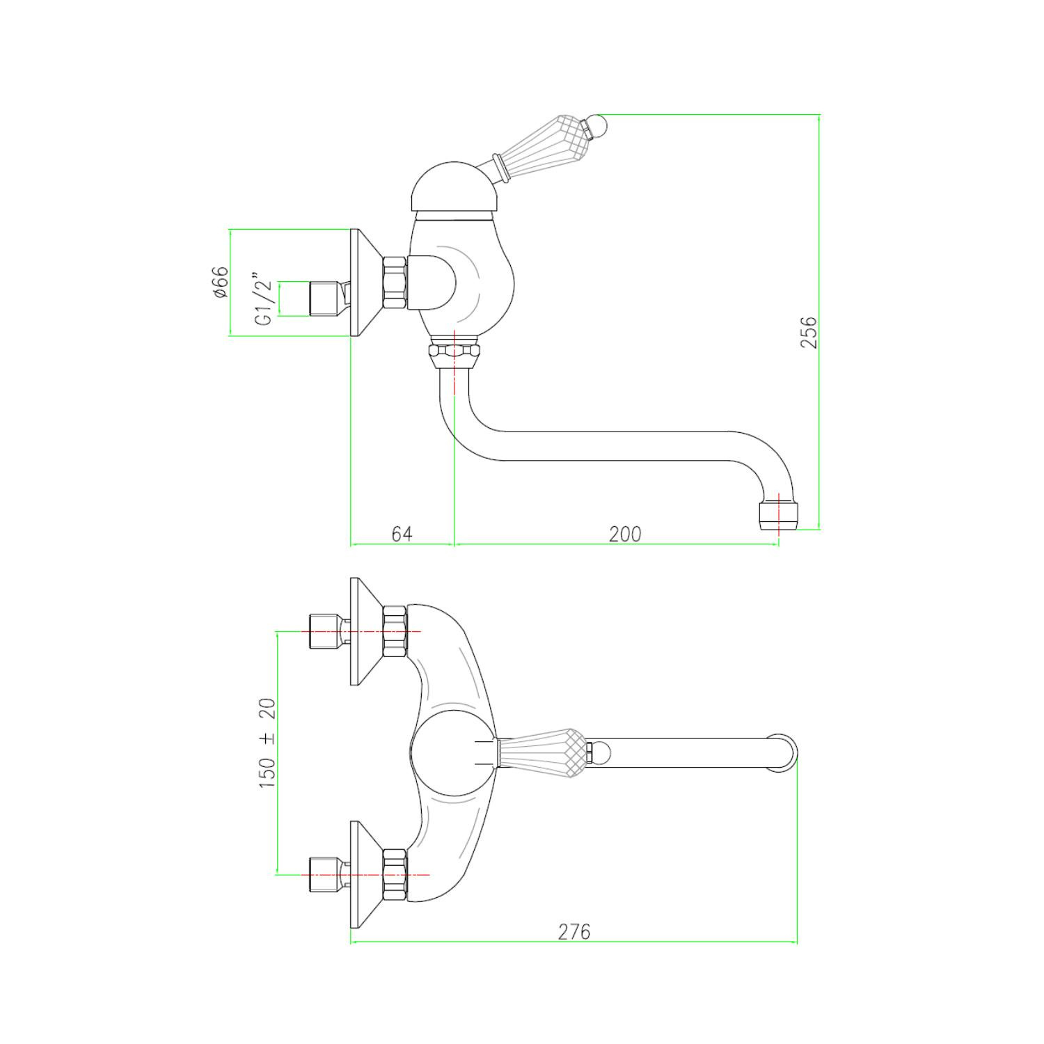 De sierlijke uitloop heeft een lengte van 20 cm. De badkraan dient aan de wand bevestigd te worden. De hart-op-hart afstand van dit artikel bedraagt 15 cm, met een speling van 2 cm.