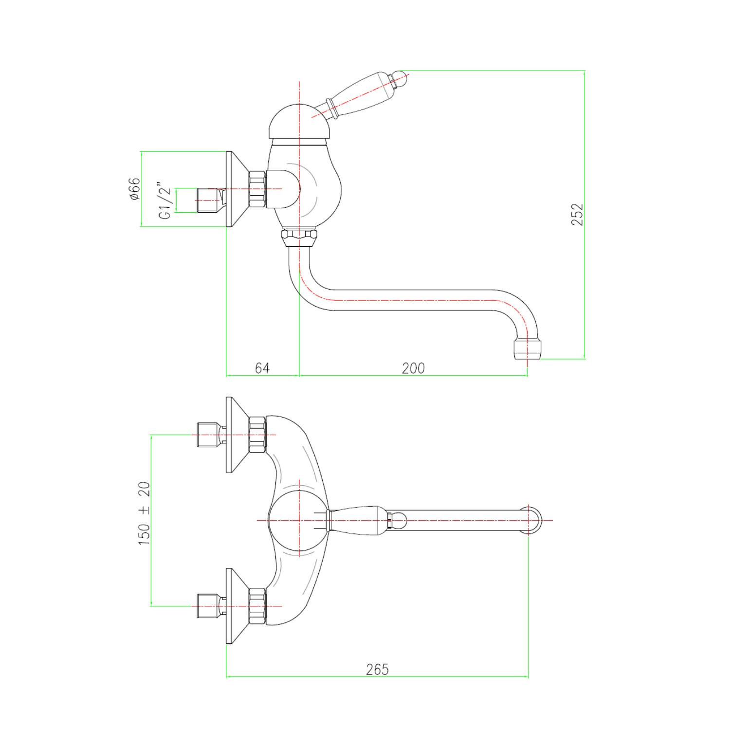 De sierlijke uitloop heeft een lengte van 20 cm. De badkraan dient aan de wand bevestigd te worden. De hart-op-hart afstand van dit artikel bedraagt 15 cm, met een speling van 2 cm.
