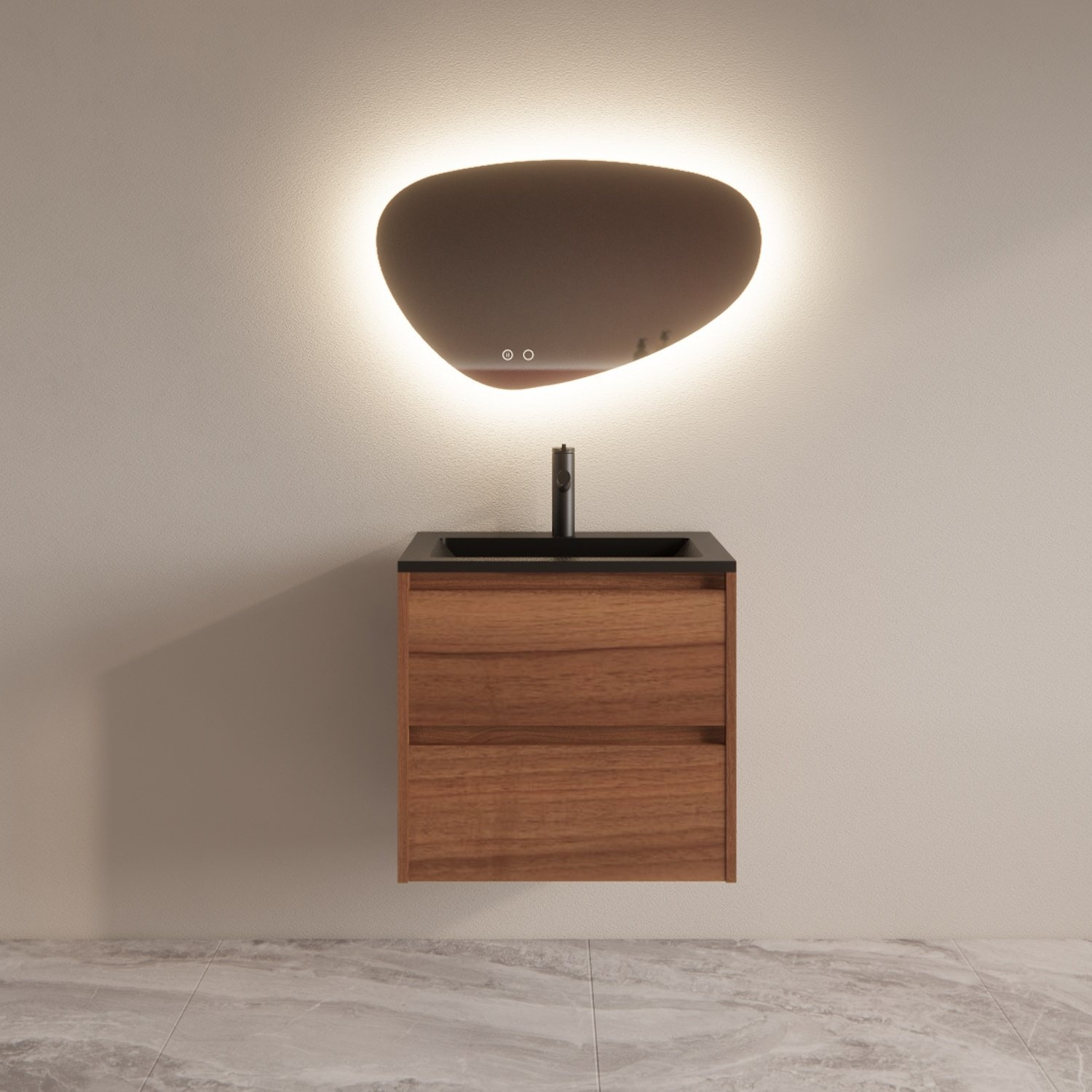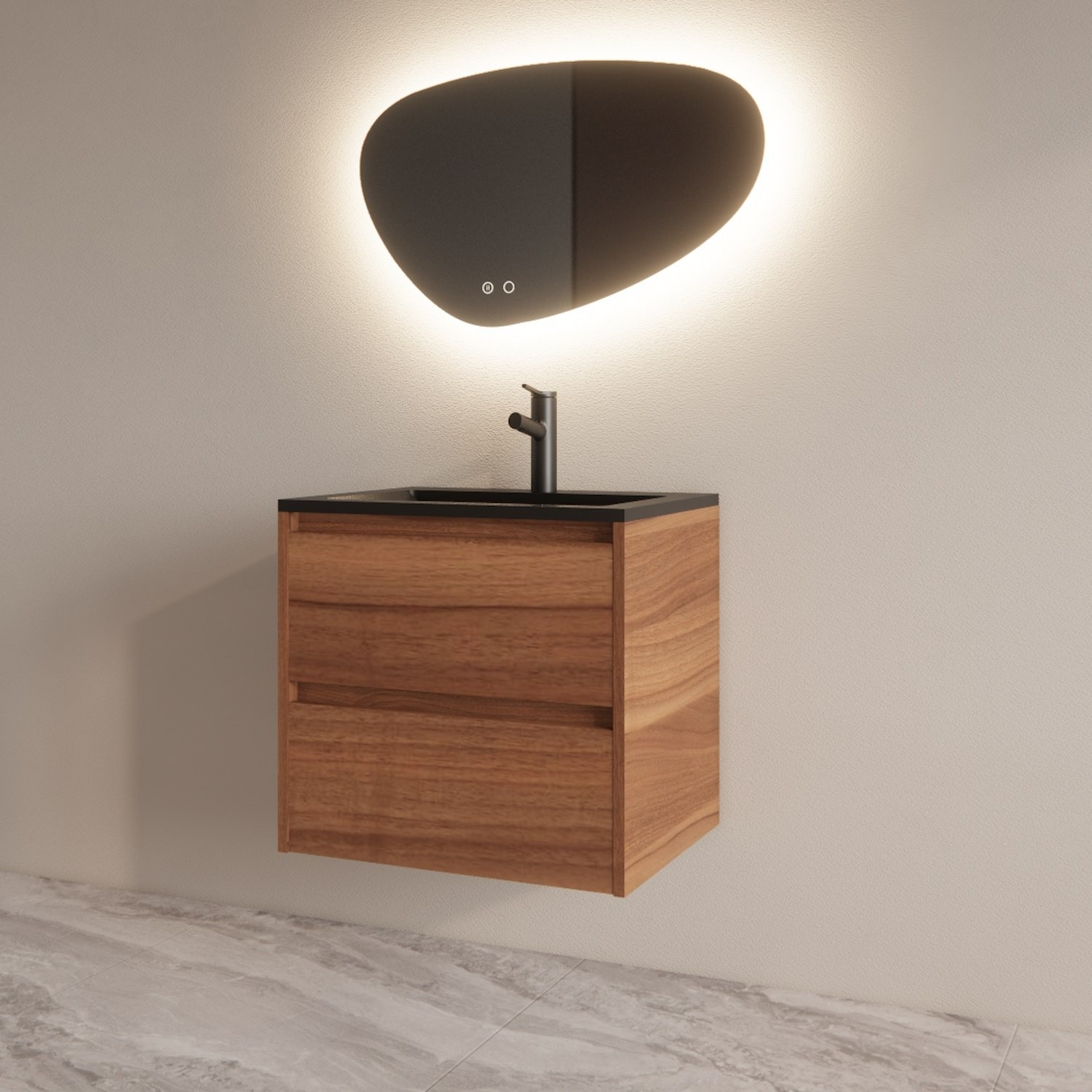 De wastafel is gemaakt van Cast Marble. Met een afmeting van maar liefst 60 cm breed en 45.5 cm diep dekt deze de volledige bovenkant van de onderkast. De onderkast word geleverd met mat zwarte wastafel. Dit meubel is op onze website ook verkrijgbaar met een Witte, Mat Witte of Cappuccino kleurige wastafel. De wastafel wordt standaard geleverd zonder kraangat, deze is te wijzigen naar een wastafel met 1 kraangat.