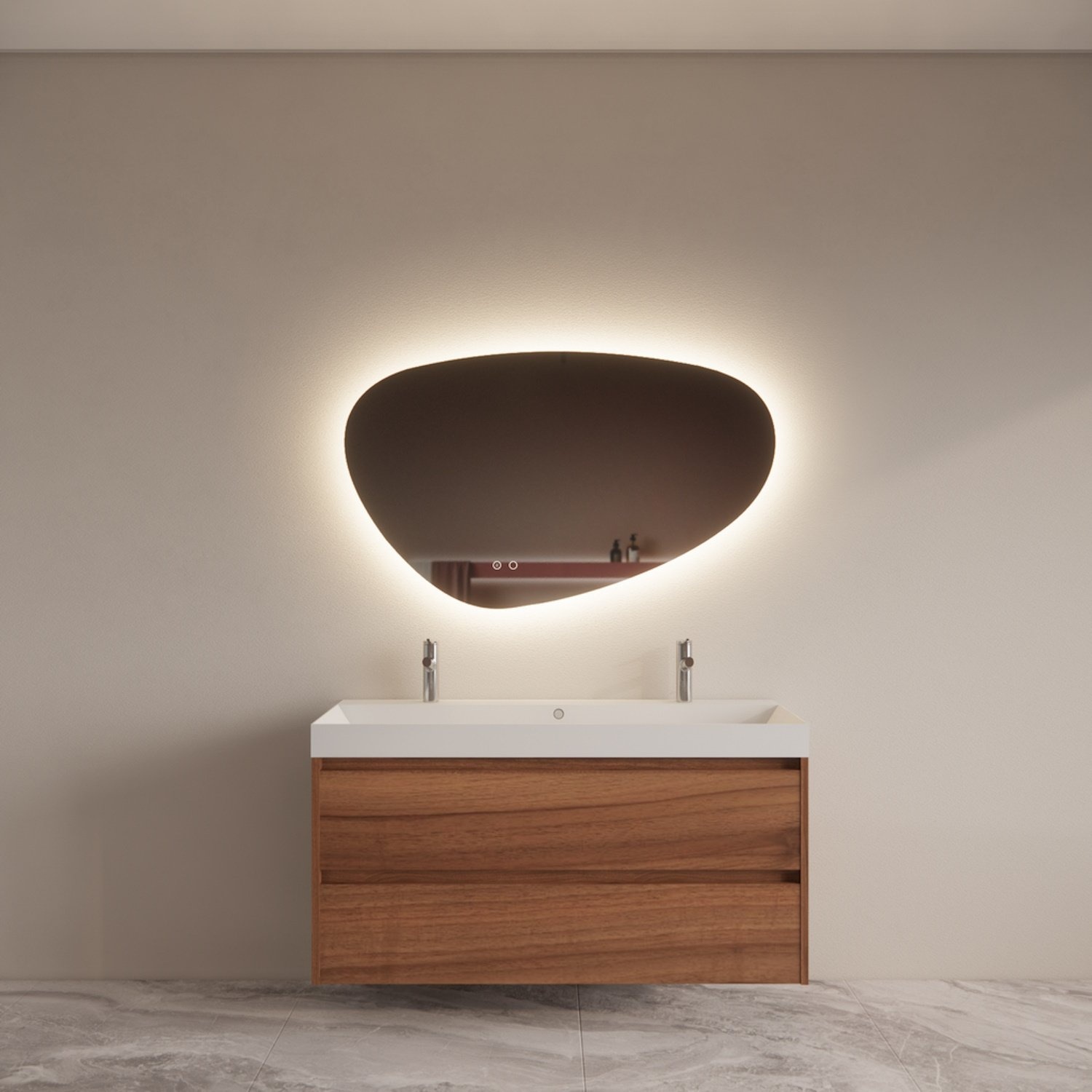 Deze set wordt standaard geleverd zonder spiegel. Hierdoor kunt u zelf kiezen wat voor maat en vorm spiegel u bij de set plaatsen wilt. Echter hebben wij 3 opties toegevoegd die u tegen bijbetaling kunt mee bestellen mocht u er niet uit komen.