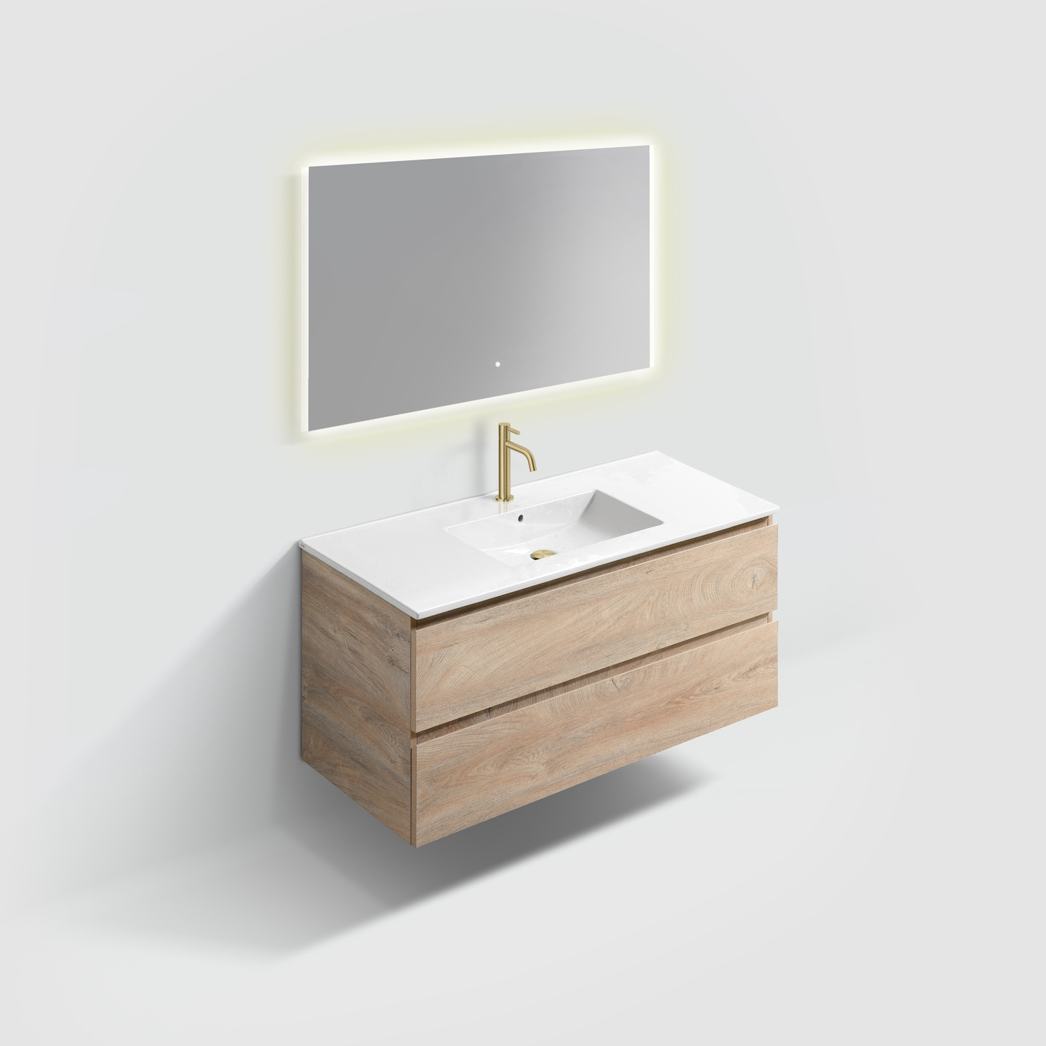 Transformeer je badkamer met de stijlvolle en functionele badmeubelset Clou InBe van 120 cm in Grieks eiken. Deze set combineert een modern design met praktische opbergruimte dankzij de twee ruime lades. De witte keramische wastafel biedt een elegant contrast en is voorzien van een handig kraangat. De set wordt compleet gemaakt met een energiezuinige LED spiegel die warm licht (2700K) verspreidt, wat zorgt voor een sfeervolle ambiance in je badkamer. Het hoogwaardige Grieks eikenlook geeft een natuurlijke en luxe uitstraling, perfect voor elke moderne badkamer.