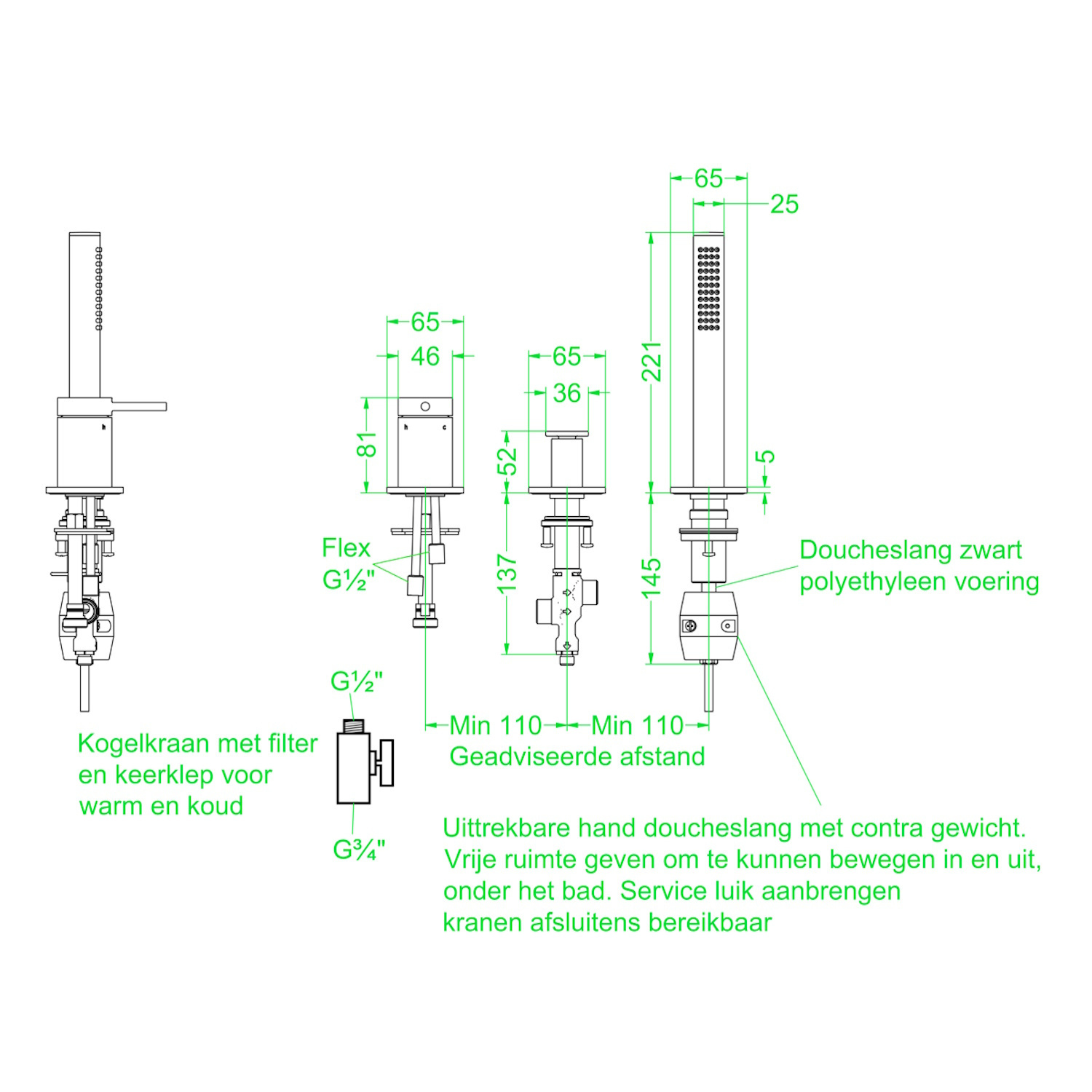 De mengkraan heeft een hoogte van 8,1 cm en een breedte van 4,6 cm. De omstelkraan heeft een hoogte van 5,2 cm en een breedte van 3,6 cm. De handdouche heeft een hoogte van 22,1 cm en een breedte van 2,5 cm. De minimale geadviseerde afstand tussen de kranen is 11 cm.