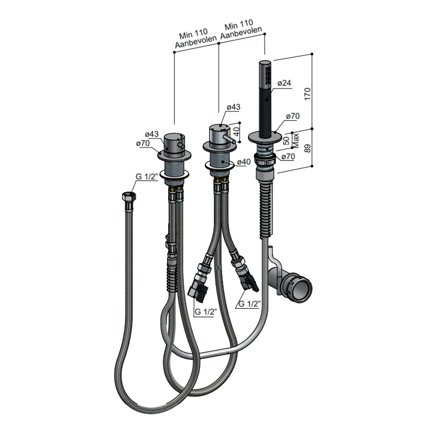 Tussen de uitloop, handdouche, omstelknop en mengkraan wordt een afstand van minimaal 11 cm geadviseerd. Deze afstand kan echter ook groter zijn. Op die manier kunt u de kraan plaatsen zoals u dat prettig vindt. De handdouche geeft maximaal 9 liter water per minuut en is 17 cm lang.