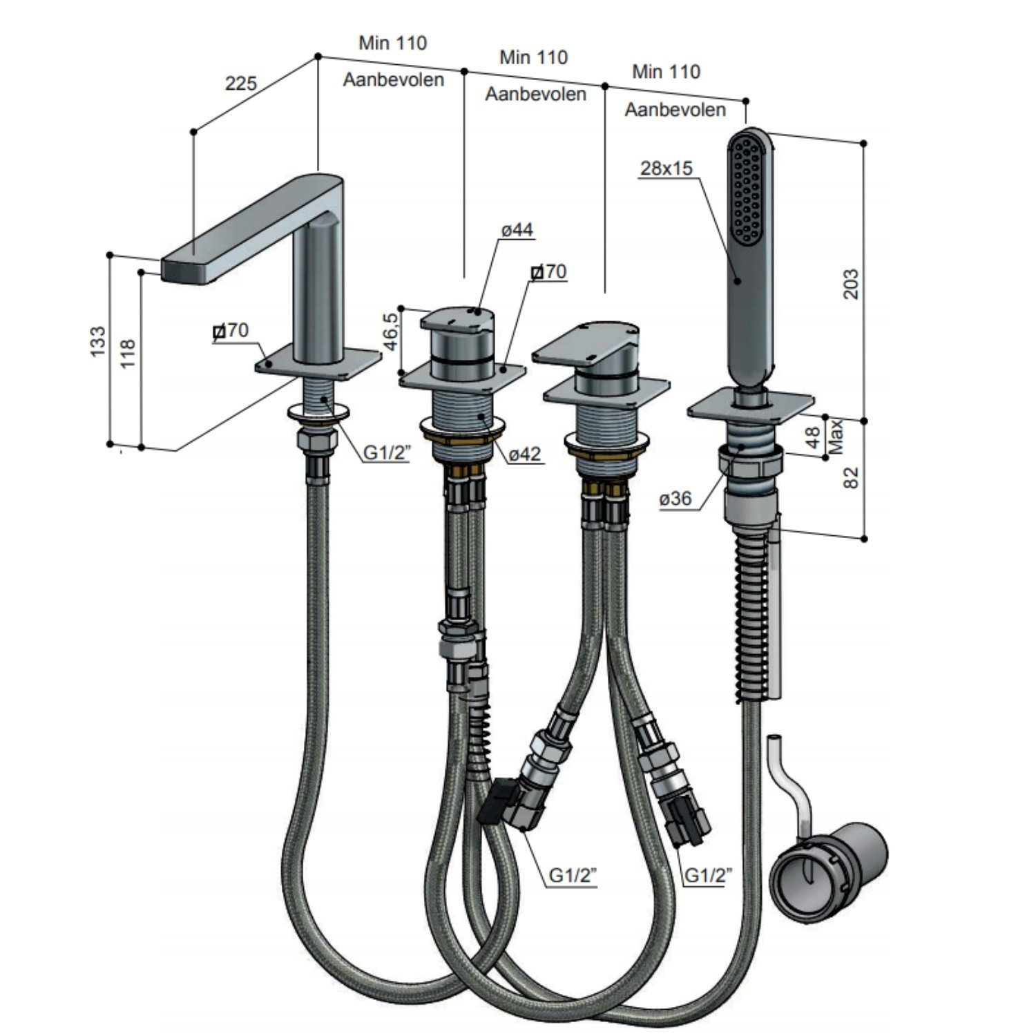 Tussen de uitloop, handdouche, omstelknop en mengkraan wordt een afstand van minimaal 11 cm geadviseerd. Deze afstand kan echter ook groter zijn. Op die manier kunt u de kraan plaatsen zoals u dat prettig vindt. De handddouche geeft maximaal 7.2 liter water per minuut.