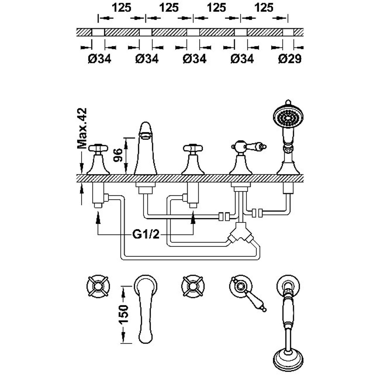 De mooie klassieke afbouwset is een 5-gats badmengkraan. Deze bevat twee kruisgrepen waarmee de temperatuur geregeld kan worden. De kraan heeft een uitloop van 15.1 cm en de handdouche is voorzien van antikalk sproeigaatjes waardoor deze makkelijk schoon te maken is.