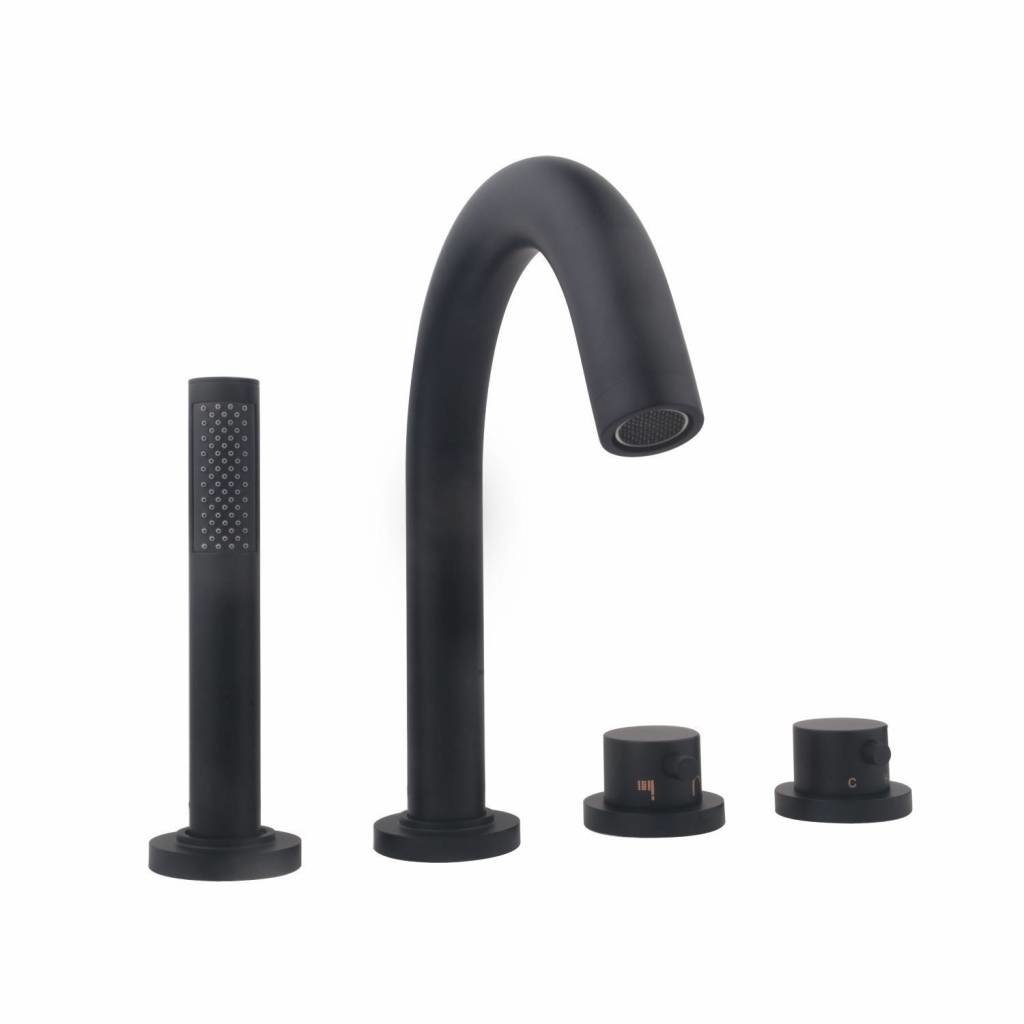 De mooie zwarte afbouwset is een 4-gats badkraan. Gat 1 bevat de verzonken ronde staaf handdouche, 2 is de bad uitloop, 3 is de knop waarmee u de kraan aan en uit zet en bepaald uit welke uitloop het water komt. In de geval uit de uitloop of uit de handdouche. De laatste knop is de thermostaat.