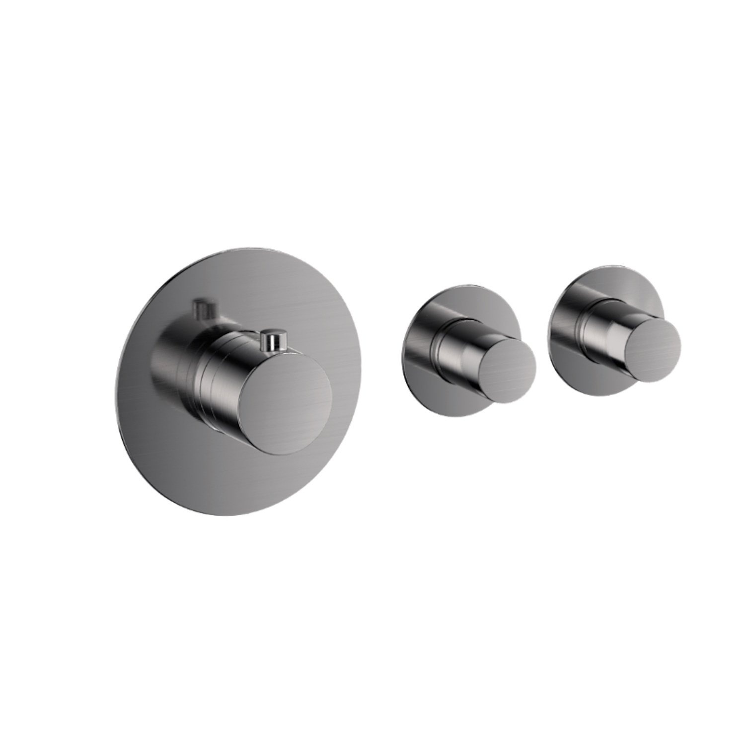 Met deze inbouw badset van de Sanilux Giles collectie maakt u uw bad compleet. Deze set bevat een inbouwbox thermostaat, muurbevestiging, doucheslang, staafhanddouche, baduitloop en bedieningsknoppen. De inbouwbox heeft een inbouwdiepte van 7,2 tot 9,2 cm. Met de handige bedieningsknoppen kunt u de gewenste temperatuur instellen én bepalen of u het water uit de baduitloop wilt laten lopen, of uit de handdouche.