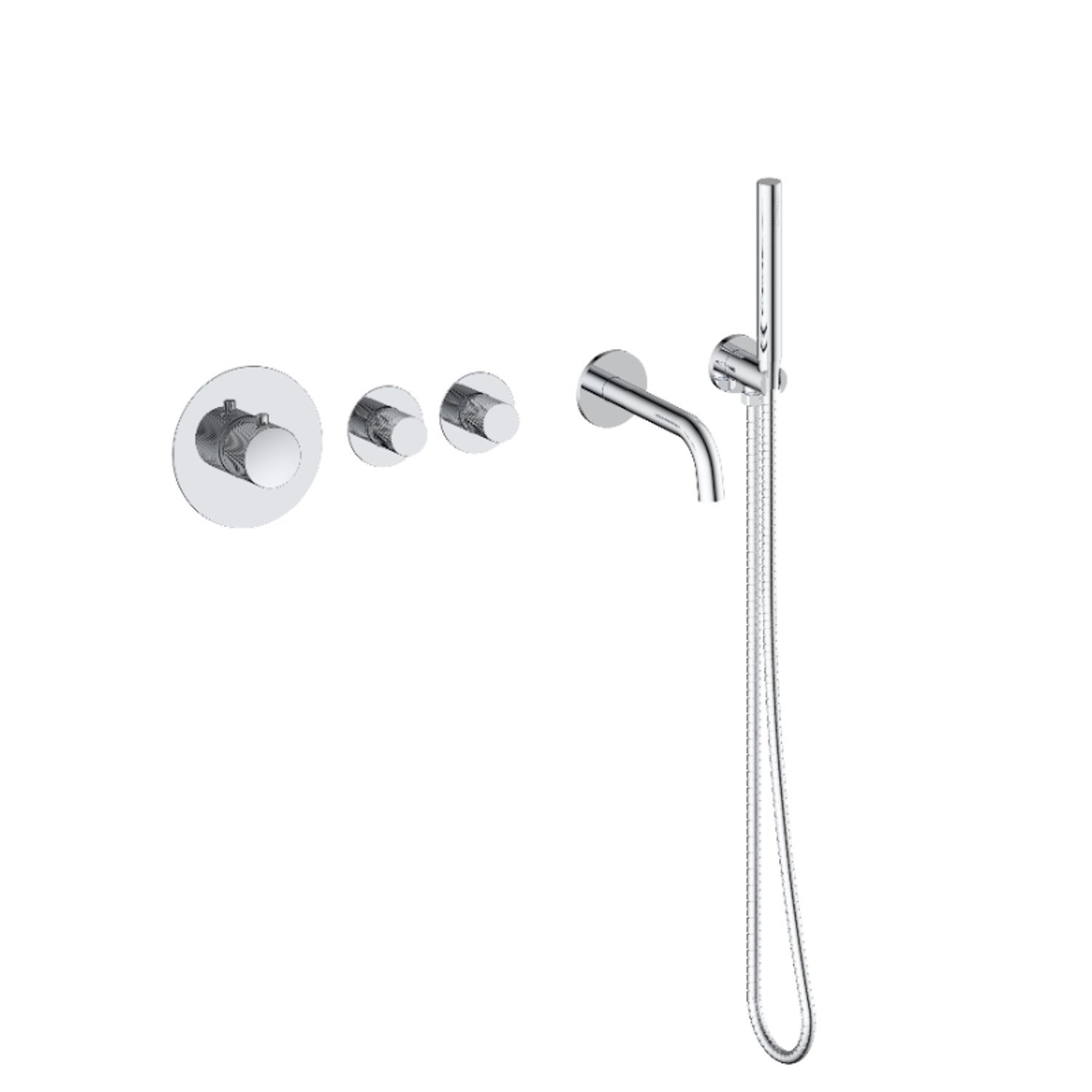 Met deze inbouw badset van de Sanilux Giles collectie maakt u uw bad compleet. Deze set bevat een inbouwbox thermostaat, muurbevestiging, doucheslang, staafhanddouche, baduitloop en bedieningsknoppen. De inbouwbox heeft een inbouwdiepte van 7,2 tot 9,2 cm. Met de handige bedieningsknoppen kunt u de gewenste temperatuur instellen én bepalen of u het water uit de baduitloop wilt laten lopen, of uit de handdouche.