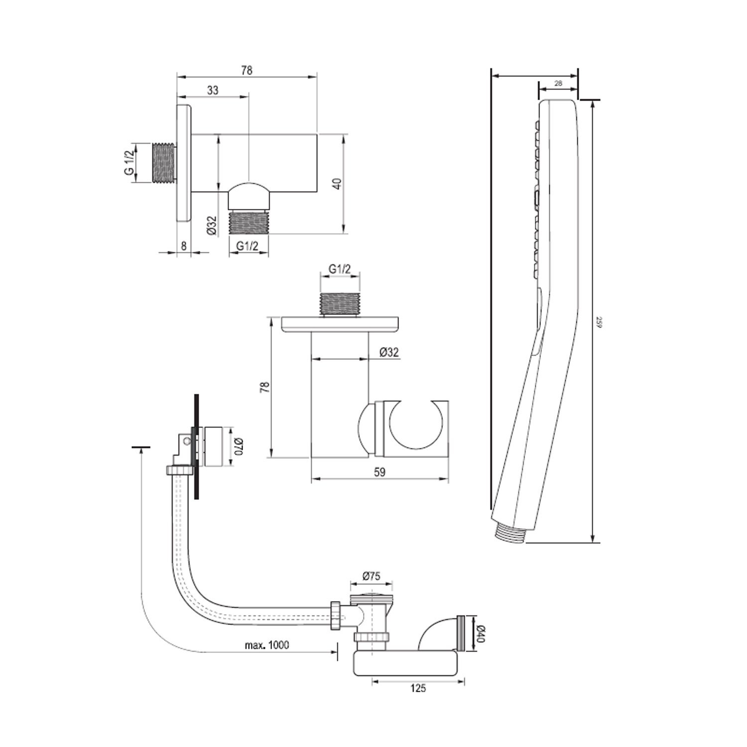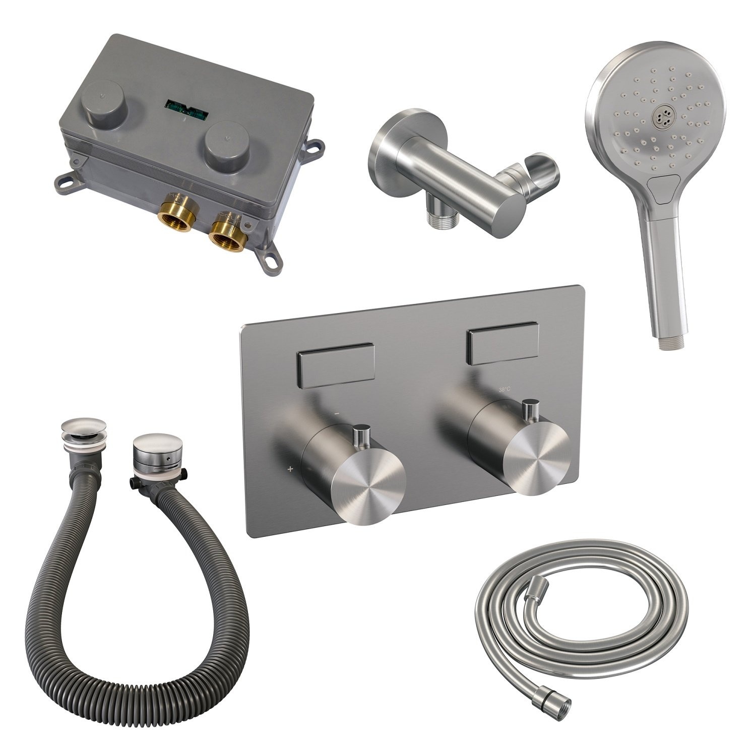 BRAUER Brushed Edition thermostatische inbouw badkraan met drukknoppen SET 04 met badvulcombinatie en 3-standen handdouche en doucheslang en wandaansluitbocht RVS geborsteld PVD