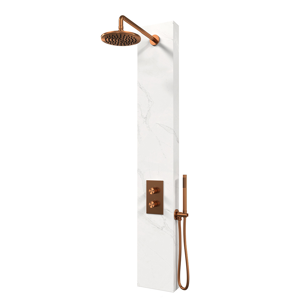 Douchepaneel van het merk Brauer behoort tot de speciale Edition-serie. Het douchepaneel is gemaakt van messing staal waardoor het uitstekend tot recht komt in vochtige ruimtes. De douchezuil heeft een Marmer look, ook wel calacatta genoemd. De nerf in de print heeft een warme tint (gold). De Brauer Calacatta gold is in maar liefst 6 verschillende uitvoeringen te bestellen. Dit betreft de set met de geborsteld koper (messing) kranen.