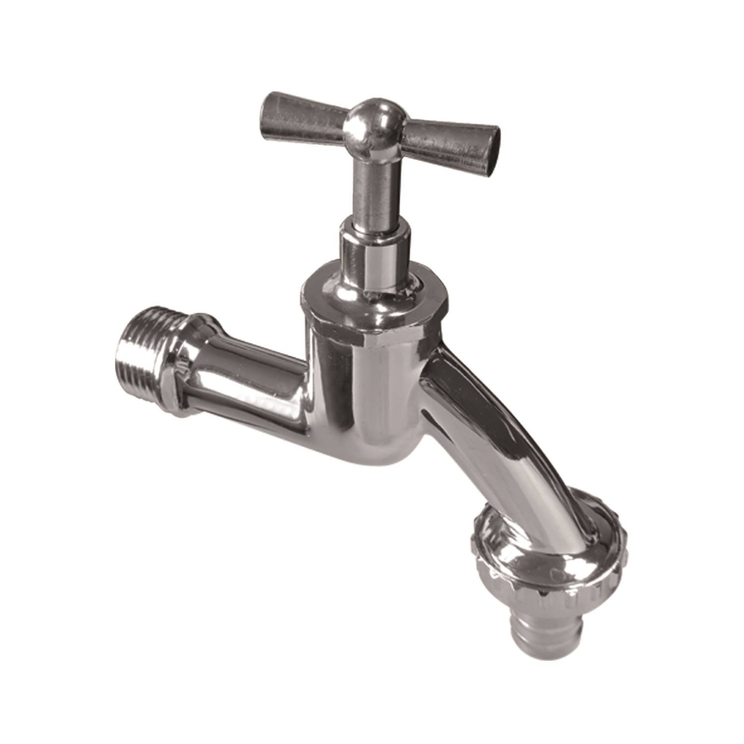 Deze verchroomde dubbeldienstkraan Eco 1/2 gebruik je voor twee doeleinden. Je kan ze gebruiken als gewone kraan, om bijvoorbeeld een emmer te vullen of om je handen te wassen, maar de dubbeldienstkraan kan ook dienen als aansluiting, om bijvoorbeeld een flexibel of tuinslang op aan te sluiten.