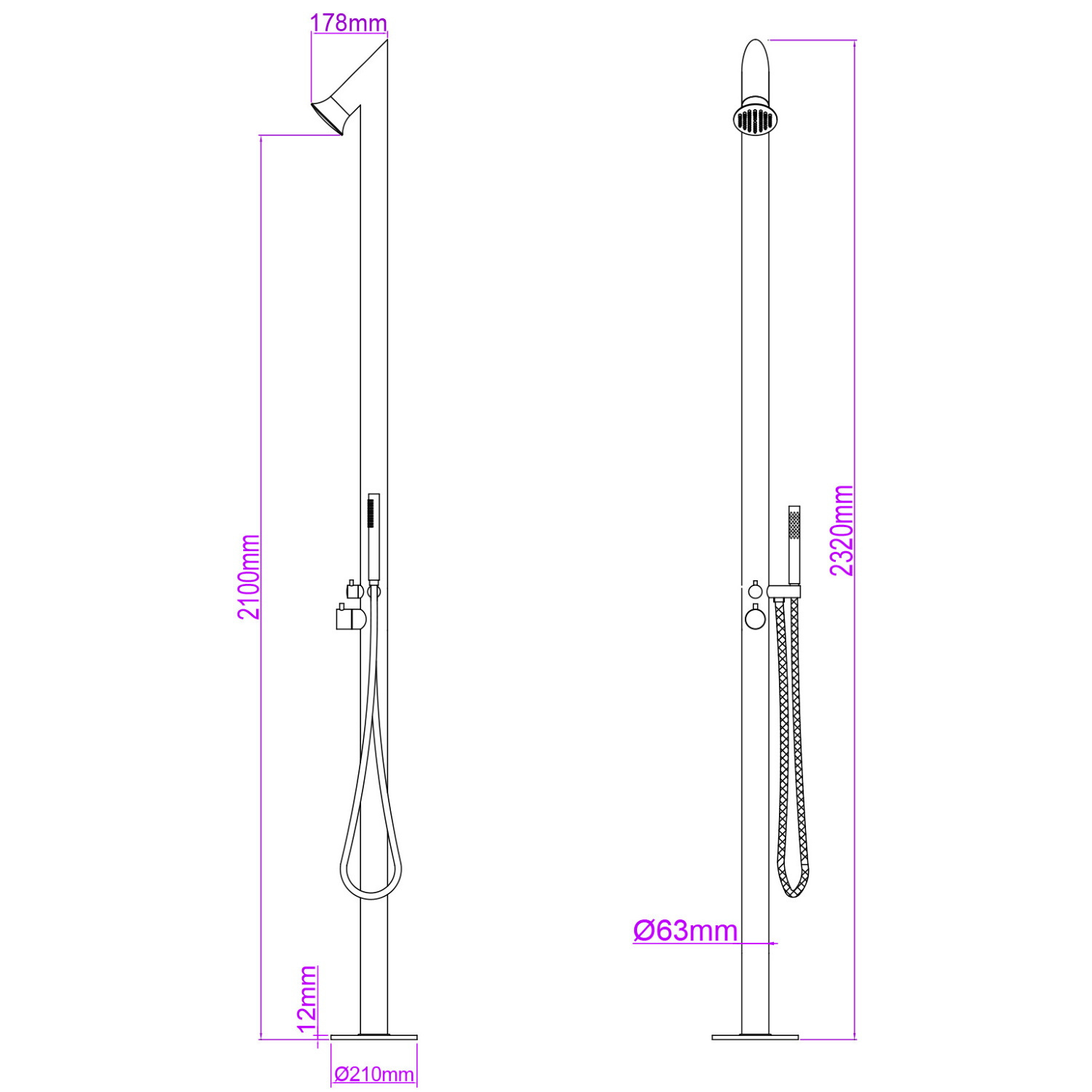 De douche is gemaakt van RVS 316. Dit is het meest hoogwaardige RVS dat er bestaat en dat maakt de tuindouche bestand tegen alle weeromstandigheden. De buitendouche is 232 cm hoog en 6.3 cm breed.