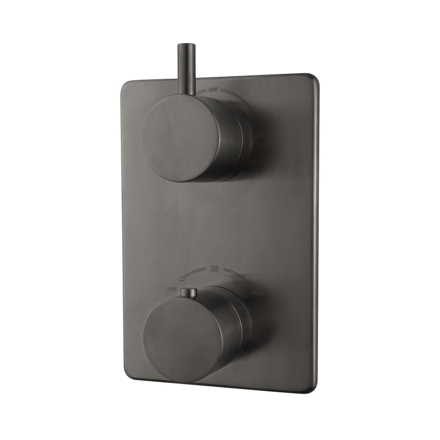 Deze gunmetal thermostatische douchekraan is de eyecatcher van uw badkamer! In combinatie met andere elementen in de kleur gunmetal creëert u een badkamer rijk aan design! De thermostaat bestaat uit 2 bedieningen: een bediening is voor de thermostaat en de andere bediening gebruikt u om de kraan mee aan of uit te zetten en u kunt bepalen welke van de twee aansluitingen u wilt gebruiken. Bijvoorbeeld om de handdouche of de hoofddouche aan te zetten. Deze luxe is ideaal voor als u even heerlijk wilt ontspannen. De aftappunten zijn niet tegelijk te gebruiken.