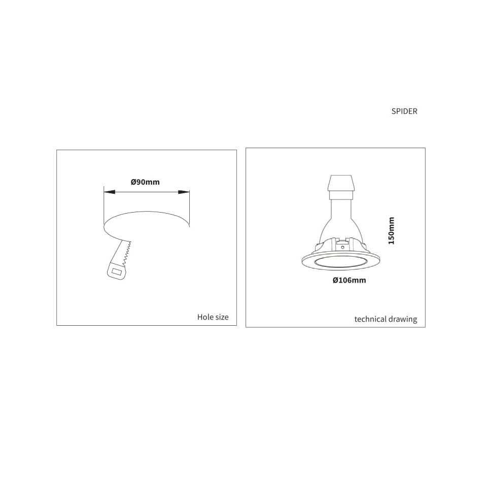 Afmeting is 10.6x15cm en heeft een vermogen van 5 Watt. Om deze te plaatsen moet u een ruimte creëren met een diameter van 90mm.