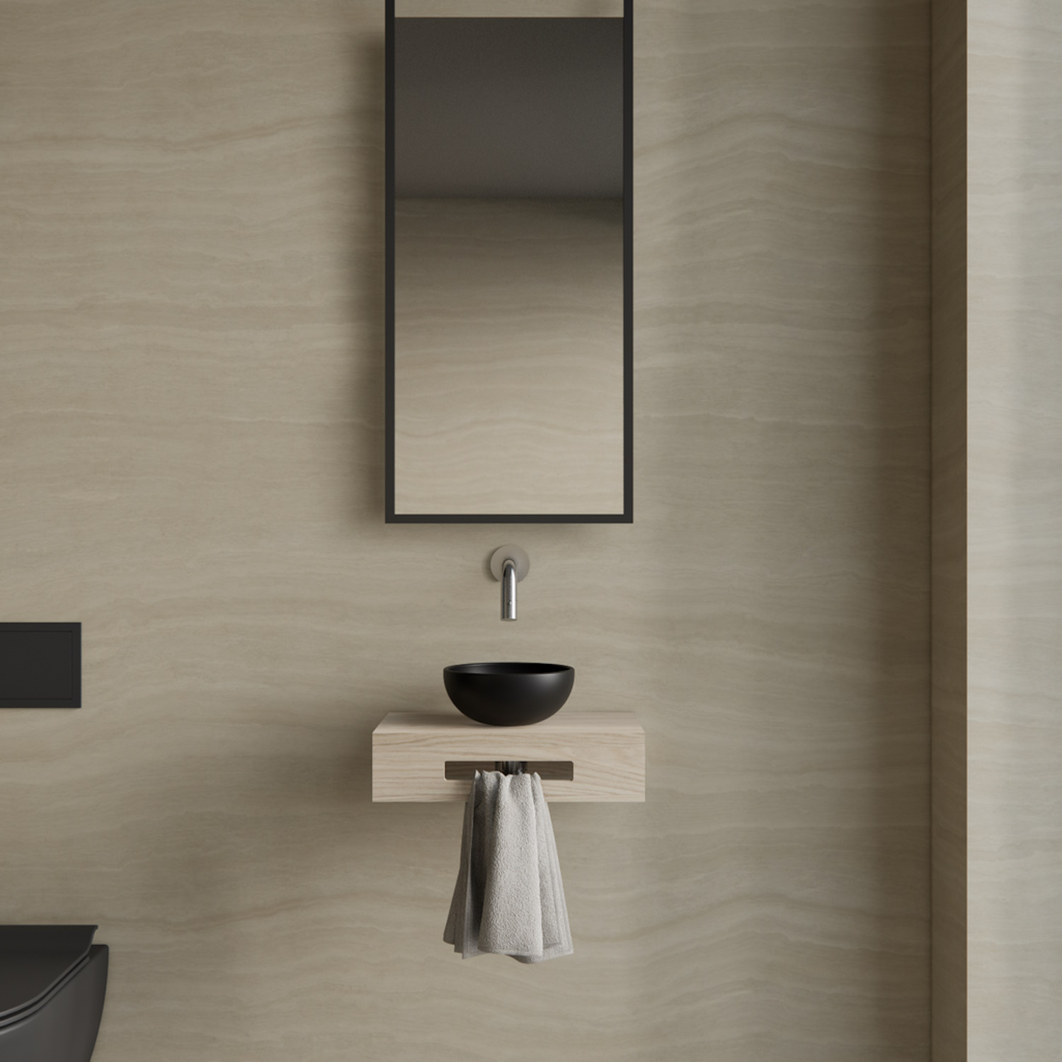 De fonteinplank wordt geleverd zonder afvoergat, zodat u zelf kunt bepalen waar u het gat voor de waskom wilt plaatsen. Maak van uw badkamer een stijlvolle en functionele ruimte met de Complete Fonteinset BWS Hold!