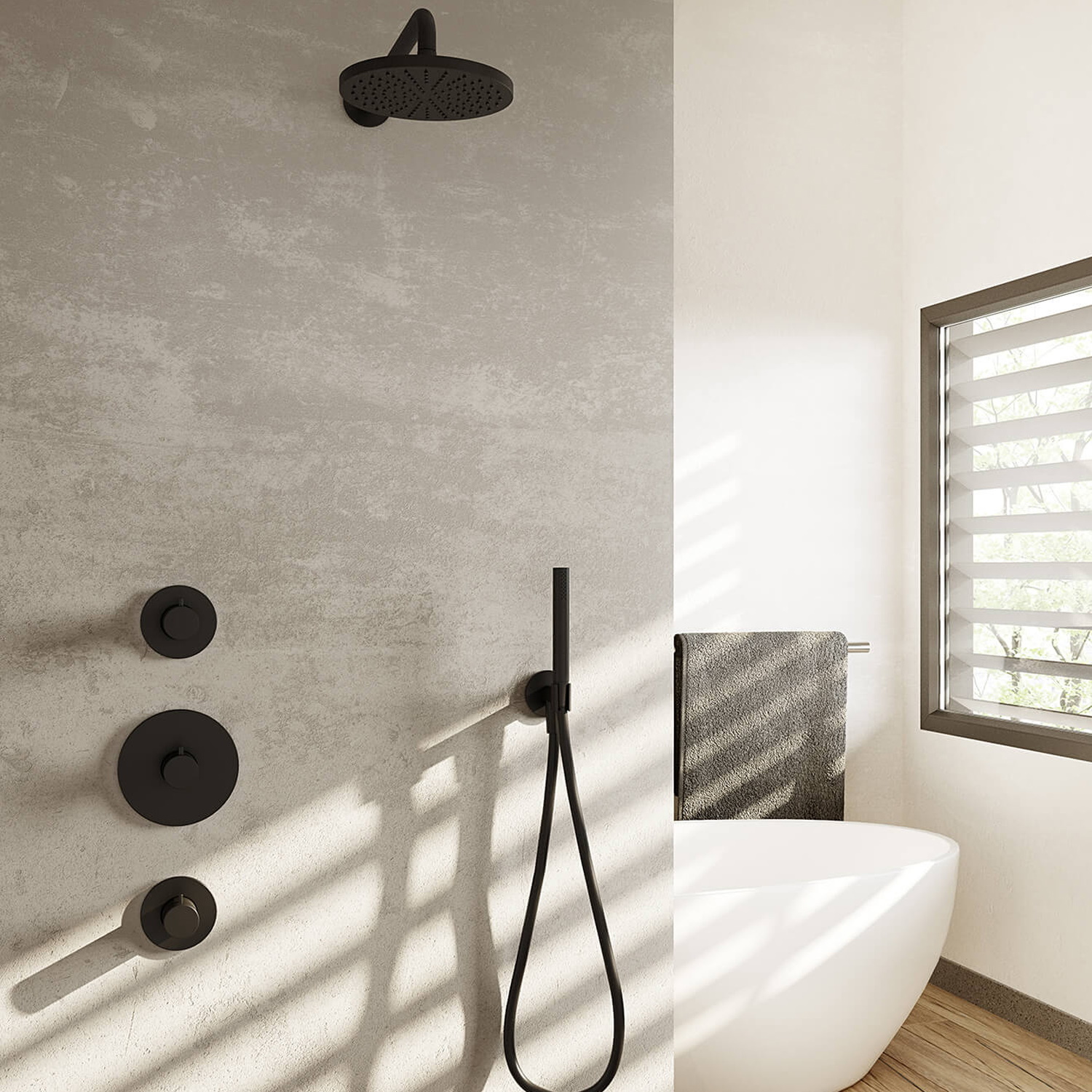 Naast de ingebouwde stopkranen wordt deze basisset geleverd met een hoofddouche, bijpassende ronde muuruitloop of plafonduitloop, een handdouche en een wandsteun of glijstang.