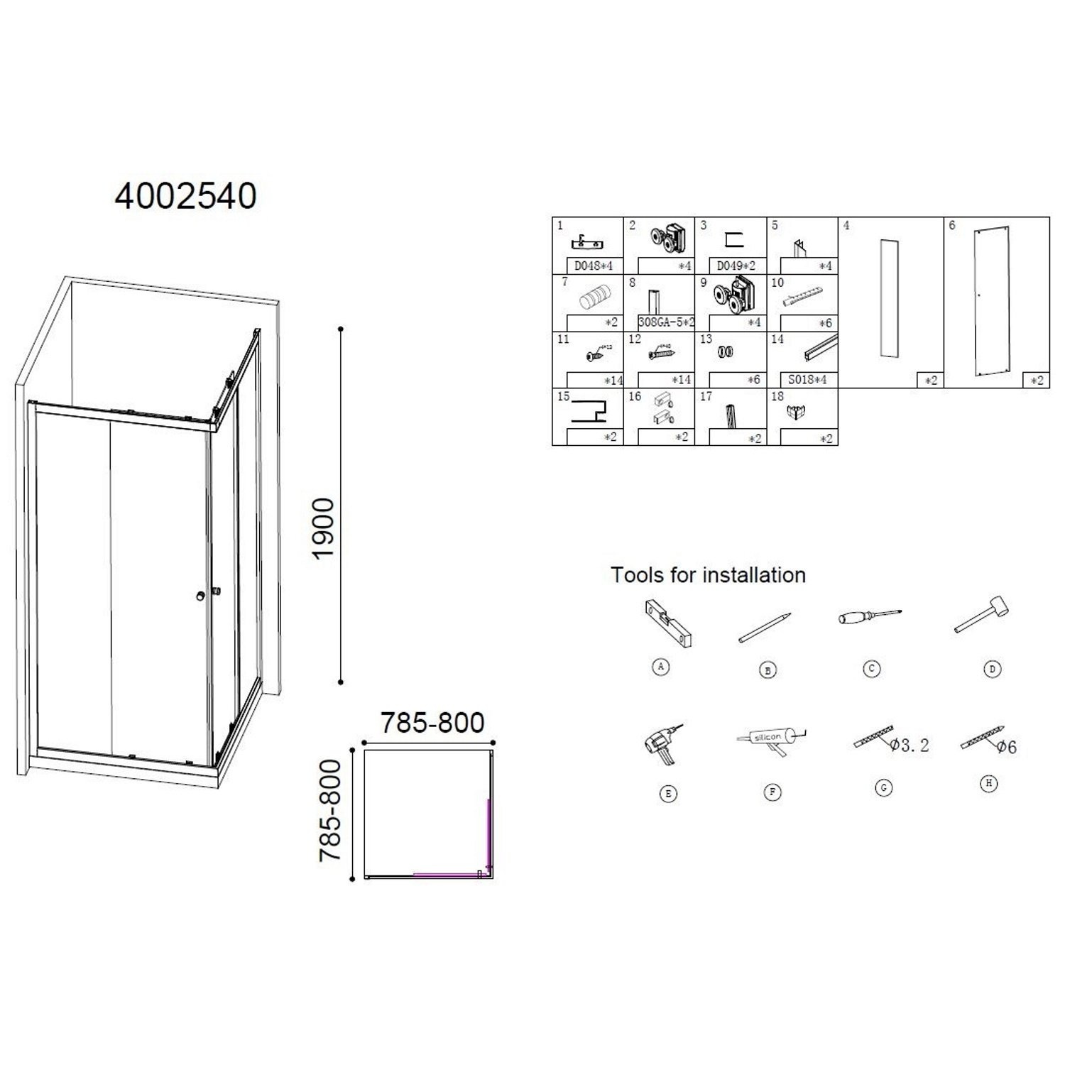 De verstelbaarheid van het profiel is 1.5 cm. De afmeting bedraagt 80X80X190cm. Een douchebak wordt niet meegeleverd.