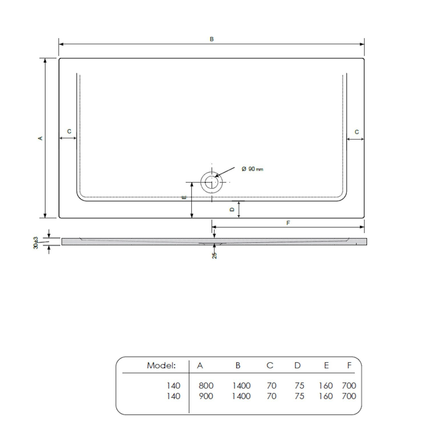 Deze douchebak heeft een breedte van 140 cm, een lengte van 90 cm en een hoogte van 1.5 cm. Deze douchebak is zelfdragend, er zijn dus geen extra poten nodig bij montage.