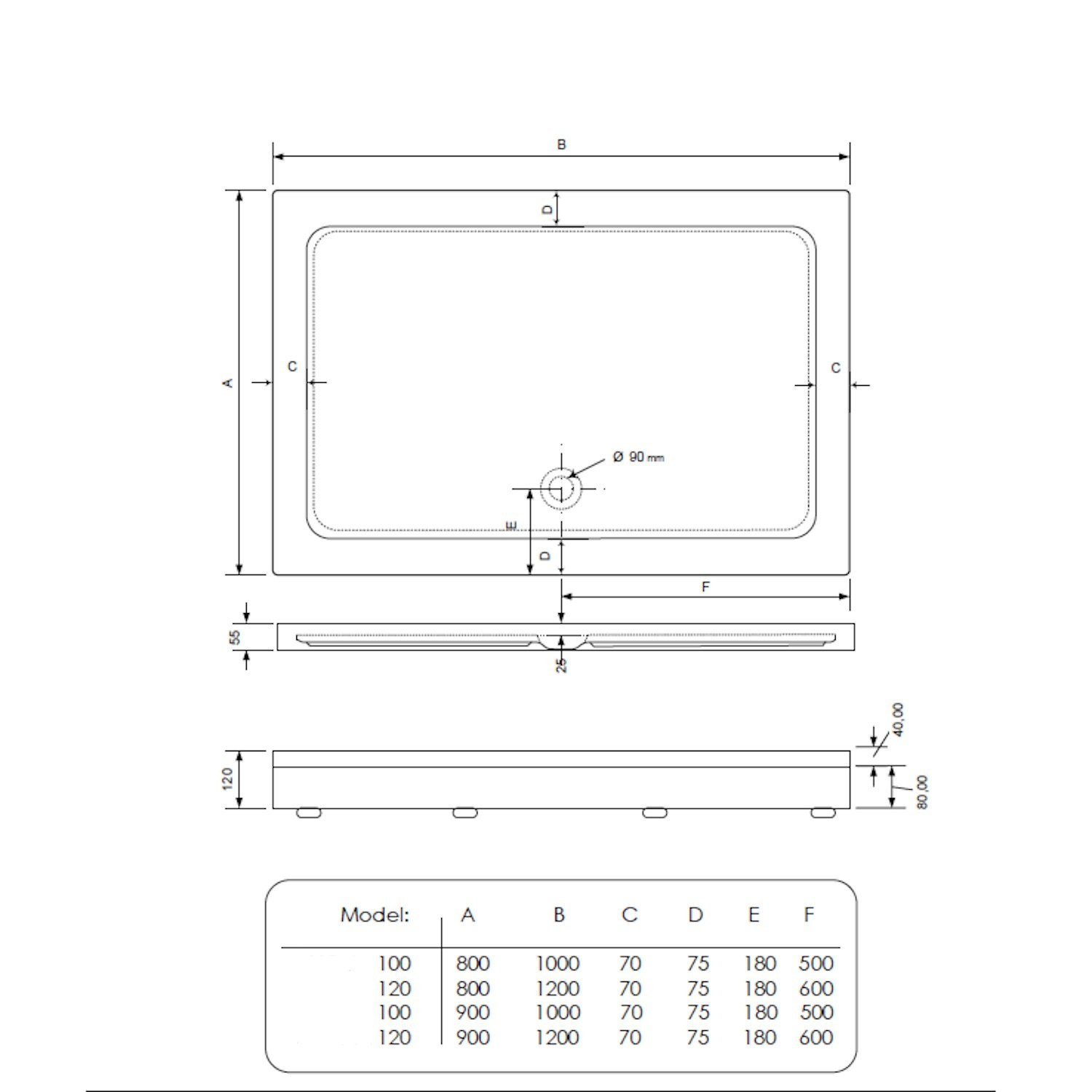 De douchebak heeft een afmeting van 100 cm bij 80 cm. Deze douchebak is zelfdragend, er zijn dus geen extra poten nodig bij montage.